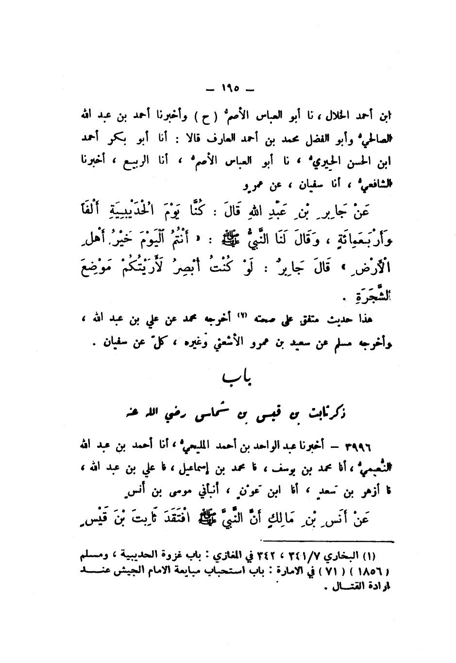 ح وَأَخْبَرَنَا أَحْمَدُ بْنُ عَبْدِ اللَّهِ الصَّالِحِيُّ، وَأَبُو الْفَضْلِ مُحَمَّدُ بْنُ أَحْمَدَ الْعَارِفُ، قَالا: أَنَا أَبُو بَكْرٍ أَحْمَدُ بْنُ الْحَسَنِ الْحِيرِيُّ، نَا أَبُو الْعَبَّاسِ الأَصَمُّ، أَنَا الرَّبِيعُ، أَخْبَرَنَا الشَّافِعِيُّ، أَنَا سُفْيَانُ، عَنْ عَمْرٍو، عَنْ جَابِرِ بْنِ عَبْدِ اللَّهِ، قَالَ: كُنَّا يَوْمَ الْحُدَيْبِيَةِ أَلْفًا وَأَرْبَعِ مِائَةٍ، وَقَالَ لَنَا النَّبِيُّ صَلَّى اللهُ عَلَيْهِ وَسَلَّمَ: «أَنْتُمُ الْيَوْمَ خَيْرُ أَهْلِ الأَرْضِ»، قَالَ جَابِرٌ: لَوْ كُنْتُ أُبْصِرُ لأَرَيْتُكُمْ مَوْضِعَ الشَّجَرَةِ.
