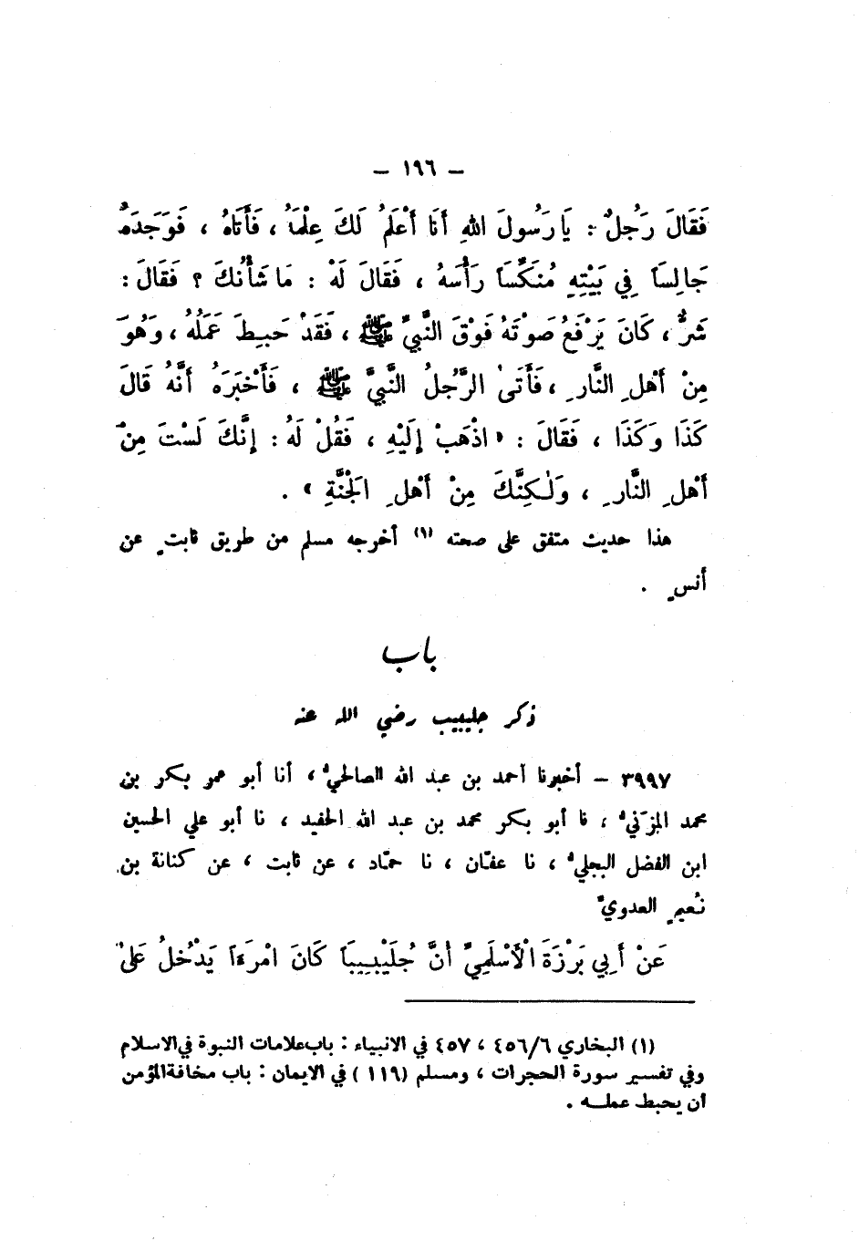 3997 - أَخْبَرَنَا أَحْمَدُ بْنُ عَبْدِ اللَّهِ الصَّالِحِيُّ، أَنَا أَبُو عُمَرَ بَكْرُ بْنُ مُحَمَّدٍ الْمُزَنِيُّ، نَا أَبُو بَكْرٍ مُحَمَّدُ بْنُ عَبْدِ اللَّهِ الْحَفِيدُ، نَا أَبُو عَلِيٍّ الْحُسَيْنُ بْنُ الْفَضْلِ الْبَجْلِيُّ، نَا عَفَّانُ، نَا حَمَّادٌ، عَنْ ثَابِتٍ، عَنْ كِنَانَةَ بْنَ نُعَيْمٍ الْعَدَوِيِّ، عَنْ أَبِي بَرْزَةَ الأَسْلَمِيِّ، أَنَّ جُلَيْبِيبًا كَانَ امْرَأً يَدْخُلُ عَلَى