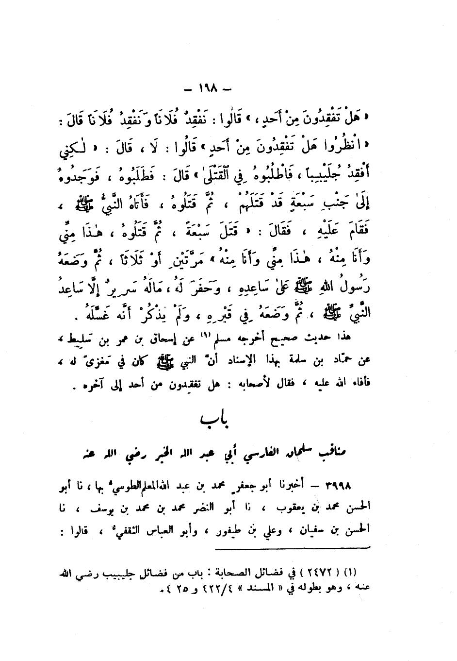 هَذَا حَدِيثٌ صَحِيحٌ أَخْرَجَهُ مُسْلِمٌ، عَنْ إِسْحَاقَ بْنِ عُمَرَ بْنِ سَلِيطٍ، عَنْ حَمَّادِ بْنِ سَلَمَةَ، بِهَذَا الإِسْنَادِ أَنَّ النَّبِيَّ صَلَّى اللهُ عَلَيْهِ وَسَلَّمَ كَانَ فِي مَغْزًى لَهُ، فَأَفَاءَ اللَّهُ عَلَيْهِ، فَقَالَ لأَصْحَابِهِ: هَلْ تَفْقِدُونَ مِنْ أَحَدٍ إِلَى آخِرِهِ