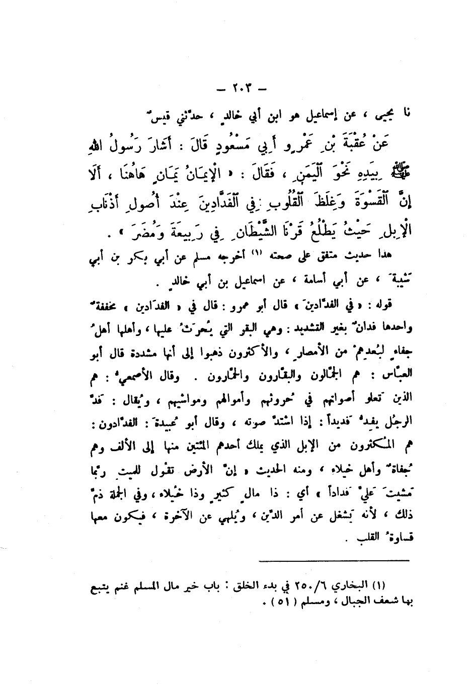 نَا يَحْيَى، عَنْ إِسْمَاعِيلَ هُوَ ابْنُ أَبِي خَالِدٍ، حَدَّثَنِي قَيْسٌ، عَنْ عُقْبَةَ بْنِ عَمْرٍو أَبِي مَسْعُودٍ، قَالَ: أَشَارَ رَسُولُ اللَّهِ صَلَّى اللهُ عَلَيْهِ وَسَلَّمَ بِيَدِهِ نَحْوَ الْيَمَنِ، فَقَالَ: «الإِيمَانُ يَمَانٍ هَهُنَا، أَلا إِنَّ الْقَسْوَةَ وَغِلَظُ الْقُلُوبِ وَفِي الْفَدَّادِينَ عِنْدَ أُصُولِ أَذْنَابِ الإِبِلِ حَيْثُ يَطْلُعُ قَرْنَا الشَّيْطَانِ فِي رَبِيعَةَ وَمُضَرَ».