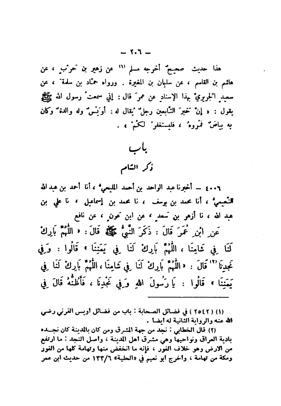 4006 - أَخْبَرَنَا عَبْدُ الْوَاحِدِ بْنُ أَحْمَدَ الْمَلِيحِيُّ، أَنَا أَحْمَدُ بْنُ عَبْدِ اللَّهِ النُّعَيْمِيُّ، أَنَا مُحَمَّدُ بْنُ يُوسُفَ، نَا مُحَمَّدُ بْنُ إِسْمَاعِيلَ، نَا عَلِيُّ بْنُ عَبْدِ اللَّهِ، نَا أَزْهَرُ بْنُ سَعْدٍ، عَنِ ابْنِ عَوْنٍ، عَنْ نَافِعٍ، عَنِ ابْنِ عُمَرَ، قَالَ: ذَكَرَ النَّبِيُّ صَلَّى اللهُ عَلَيْهِ وَسَلَّمَ قَالَ: «اللَّهُمَّ بَارِكْ لَنَا فِي شَامِنَا، اللَّهُمَّ بَارِكْ لنا فِي يَمَنِنَا»، قَالُوا: وَفِي نَجْدِنَا، قَالَ: «اللَّهُمَّ بَارِكْ لَنَا فِي شَامِنَا، اللَّهُمَّ بَارِكْ لنا فِي يَمَنِنَا»، قَالُوا: يَا رَسُولَ اللَّهِ، وَفِي نَجْدِنَا، فَأَظُنُّهُ قَالَ فِي