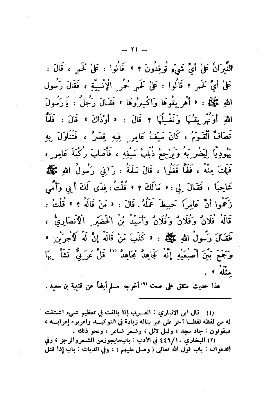 النِّيرَانُ عَلَى أَيِّ شَيْءٍ تُوقِدُونَ»؟ قَالُوا: عَلَى لَحْمٍ، قَالَ: عَلَى أَيِّ لَحْمٍ؟ قَالُوا: عَلَى لَحْمِ حُمُرِ الإِنْسِيَّةِ، فَقَالَ رَسُولُ اللَّهِ صَلَّى اللهُ عَلَيْهِ وَسَلَّمَ: «أَهْرِيقُوهَا وَاكْسِرُوهَا»، فَقَالَ رَجُلٌ: يَا رَسُولَ اللَّهِ صَلَّى اللهُ عَلَيْهِ وَسَلَّمَ أَوْ نُهْرِيقُهَا وَنَغْسِلُهَا؟ قَالَ: «أَوْ ذَاكَ»، قَالَ: فَلَمَّا تَصَافَّ الْقَوْمُ، كَانَ سَيْفُ عَامِرٍ فِيهِ قِصَرٌ، فَتَنَاوَلَ بِهِ يَهُودِيًّا لِيَضْرِبَهُ وَيَرْجِعَ ذُبَابُ سَيْفُهُ، فَأَصَابَ رُكْبَةَ عَامِرٍ، فَمَاتَ مِنْهُ، فَلَمَّا قَفَلُوا، قَالَ سَلَمَةُ: رَآنِي رَسُولُ اللَّهِ صَلَّى اللهُ عَلَيْهِ وَسَلَّمَ شَاحِبًا، فَقَالَ لِي: «مَالَكَ»؟ قُلْتُ: فِدًى لَكَ أَبِي وَأُمِّي، زَعَمُوا أَنَّ عَامِرًا حَبِطَ عَمَلُهُ، قَالَ: «مَنْ قَالَهُ»، قُلْتُ: قَالَهُ فُلانٌ وَفُلانٌ وَفُلانٌ، وَأُسَيْدُ بْنُ الْحُضَيْرِ الأَنْصَارِيُّ، فَقَالَ رَسُولُ اللَّهِ صَلَّى اللهُ عَلَيْهِ وَسَلَّمَ: «كَذَبَ مَنْ قَالَهُ، إِنَّ لَهُ لأَجْرَيْنِ، وَجَمَعَ بَيْنَ أُصْبُعَيْهِ، إِنَّهُ لَجَاهِدٌ مُجَاهِدٌ قَلَّ عَرَبِيٌّ نَشَأَ بِهَا مِثْلُهُ».