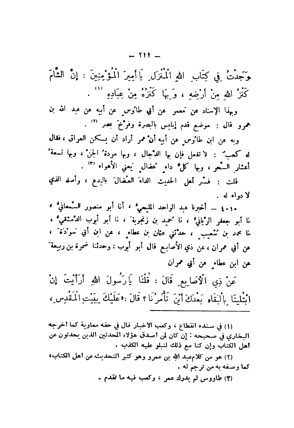 4010 - أَخْبَرَنَا عَبْدُ الْوَاحِدِ الْمَلِيحِيُّ، أَنَا أَبُو مَنْصُورٍ السَّمْعَانِيُّ، نَا أَبُو جَعْفَرٍ الرَّيَّانِيُّ، نَا حُمَيْدُ بْنُ زَنْجُوَيْهِ، نَا أَبُو أَيُّوبَ الدِّمَشْقِيُّ، نَا مُحَمَّدُ بْنُ شُعَيْبٍ، حَدَّثَنِي عُثْمَانُ بْنُ عَطَاءٍ، عَنِ ابْنِ أَبِي سَوْدَةَ، عَنْ أَبِي عِمْرَانَ، عَنْ ذِي الأَصَابِعِ، قَالَ أَبُو أَيُّوبَ , وَحَدَّثَنَا ضَمْرَةُ بْنُ رَبِيعَةَ، عَنِ ابْنِ عَطَاءٍ، عَنْ أَبِي عِمْرَانَ، عَنْ ذِي الأَصَابِعِ، قَالَ: قُلْنَا: يَا رَسُولَ اللَّهِ، أَرَأَيْتَ إِنِ ابْتُلِينَا بِالْبَقَاءِ بَعْدَكَ أَيْنَ تَأْمُرُنَا؟ قَالَ: «عَلَيْكَ بِبَيْتِ الْمَقْدِسِ،