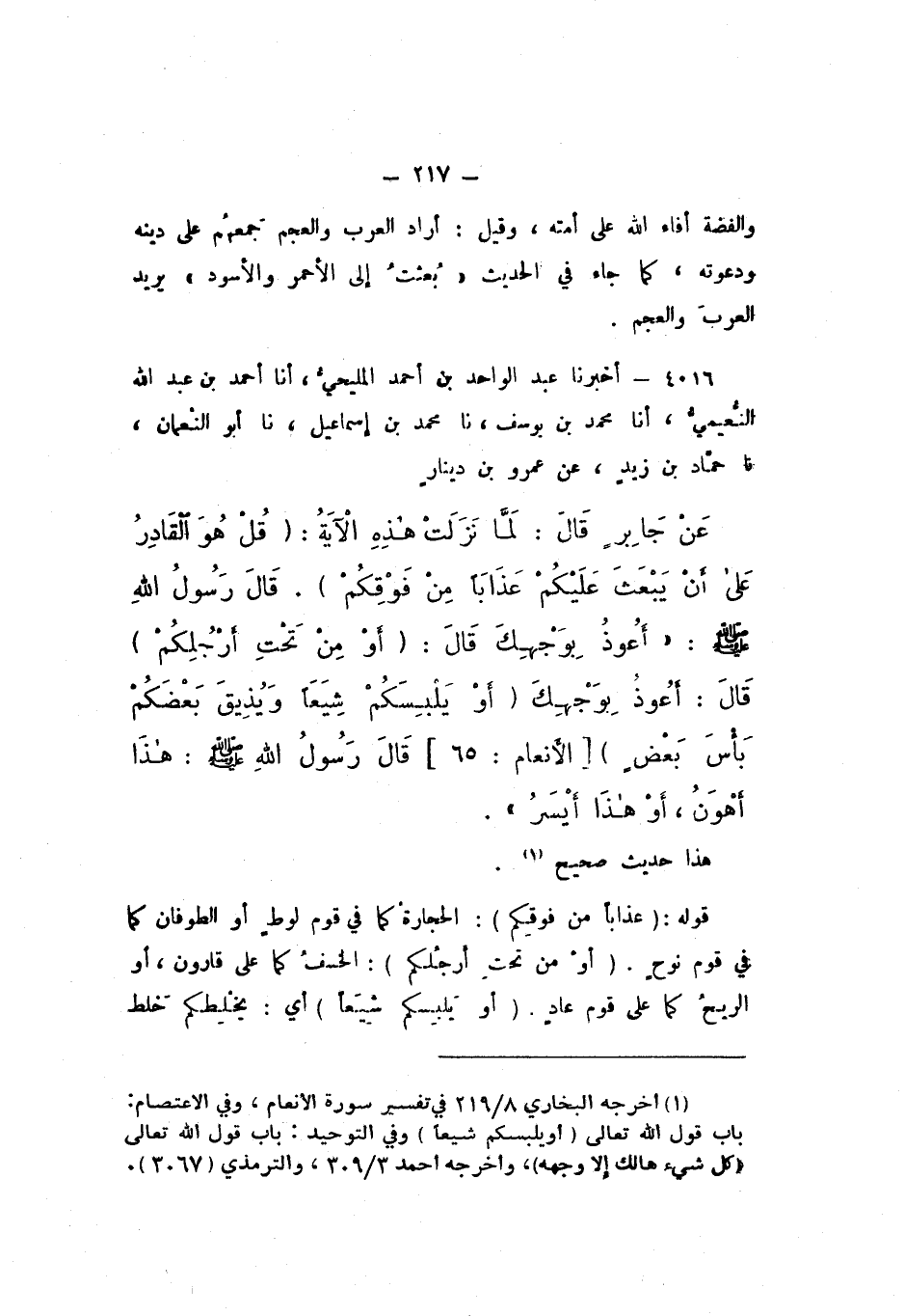 4016 - أَخْبَرَنَا عَبْدُ الْوَاحِدِ بْنُ أَحْمَدَ الْمَلِيحِيُّ، أَنَا أَحْمَدُ بْنُ عَبْدِ اللَّهِ النُّعَيْمِيُّ، أَنَا مُحَمَّدُ بْنُ يُوسُفَ، نَا مُحَمَّدُ بْنُ إِسْمَاعِيلَ، نَا أَبُو النُّعْمَانِ، نَا حَمَّادُ بْنُ زَيْدٍ، عَنْ عَمْرُو بْنُ دِينَارٍ، عَنْ جَابِرٍ، قَالَ: لَمَّا نَزَلَتْ هَذِهِ الآيَةُ: {قُلْ هُوَ الْقَادِرُ عَلَى أَنْ يَبْعَثَ عَلَيْكُمْ عَذَابًا مِنْ فَوْقِكُمْ} [الْأَنْعَام: 65]، قَالَ رَسُولُ اللَّهِ صَلَّى اللهُ عَلَيْهِ وَسَلَّمَ: «أَعُوذُ بِوَجْهِكَ»، قَالَ: {أَوْ مِنْ تَحْتِ أَرْجُلِكُمْ} [الْأَنْعَام: 65]، قَالَ: «أَعُوذُ بِوَجْهِكَ»، {أَوْ يَلْبِسَكُمْ شِيَعًا وَيُذِيقَ بَعْضَكُمْ بَأْسَ بَعْضٍ} [الْأَنْعَام: 65]، قَالَ رَسُولُ اللَّهِ صَلَّى اللهُ عَلَيْهِ وَسَلَّمَ: «هَذَا أَهْوَنُ، أَوْ هَذَا أَيْسَرُ».