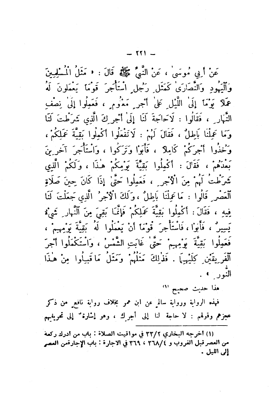 عَنْ أَبِي مُوسَى، عَنِ النَّبِيِّ صَلَّى اللهُ عَلَيْهِ وَسَلَّمَ قَالَ: «مَثَلُ الْمُسْلِمِينَ، وَالْيَهُودِ، وَالنَّصَارَى، كَمَثَلِ رَجُلٍ اسْتَأْجَرَ قَوْمًا يَعْمَلُونَ لَهُ عَمَلا يَوْمًا إِلَى اللَّيْلِ عَلَى أَجْرٍ مَعْلُومٍ، فَعَمِلُوا إِلَى نِصْفِ النَّهَارِ»، فَقَالُوا: لَا حَاجَةَ لَنَا إِلَى أَجْرِكَ الَّذِي شَرَطْتَ لَنَا وَمَا عَمِلْنَا بَاطِلٌ، فَقَالَ لَهُمْ: لَا تَفْعَلُوا أَكْمِلُوا بَقِيَّةَ عَمَلِكُمْ، وَخُذُوا أَجْرَكُمْ كَامِلا، فَأَبَوْا وَتَرَكُوا، وَاسْتَأْجَرَ آخَرِينَ بَعْدَهُمْ، فَقَالَ: أَكْمِلُوا بَقِيَّةَ يَوْمِكُمْ هَذَا، وَلَكُمُ الَّذِي شَرَطْتُ لَهُمْ مِنَ الأَجْرِ، فَعَمِلُوا حَتَّى إِذَا كَانَ حِينَ صَلاةِ الْعَصْرِ "، قَالُوا: مَا عَمِلْنَا بَاطِلٌ، وَلَكَ الأَجْرُ الَّذِي جَعَلْتَ لَنَا فِيهِ، فَقَالَ: «أَكْمِلُوا بَقِيَّةَ عَمَلِكُمْ، فَإِنَّمَا بَقِيَ مِنَ النَّهَارِ شَيْءٌ يَسِيرٌ، فَأَبَوْا، فَاسْتَأْجَرَ قَوْمًا أَنْ يَعْمَلُوا لَهُ بَقِيَّةَ يَوْمِهِمْ، فَعَمِلُوا بَقِيَّةَ يَوْمِهِمْ حَتَّى غَابَتِ الشَّمْسُ، وَاسْتَكْمَلُوا أَجْرَ الْفَرِيقَيْنِ كِلَيْهِمَا، فَذَلِكَ مَثَلُهُمْ وَمَثَلُ مَا قَبِلُوا مِنْ هَذَا النُّورِ».