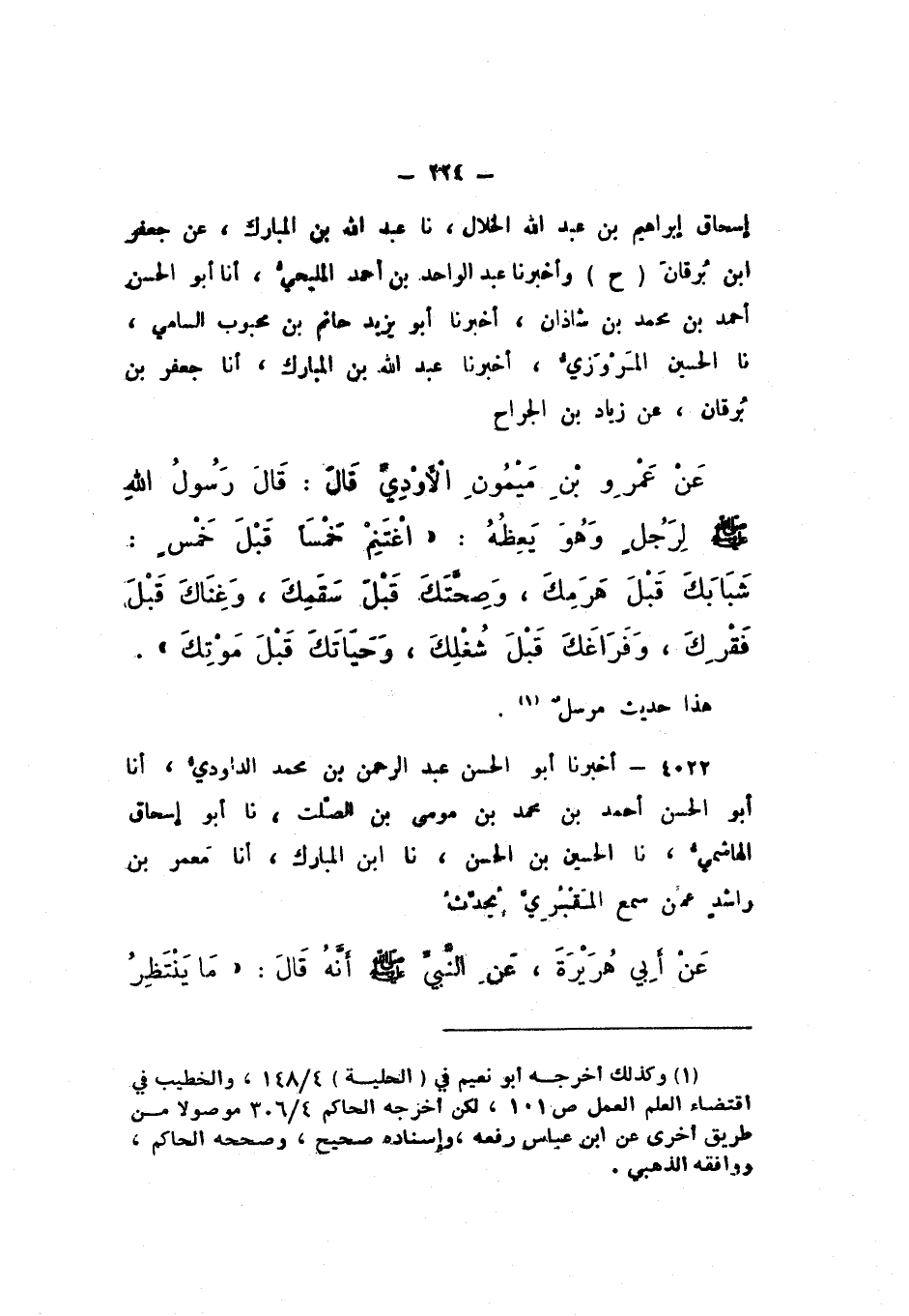 ح وَأَخْبَرَنَا عَبْدُ الْوَاحِدِ بْنُ أَحْمَدَ الْمَلِيحِيُّ، أَنَا أَبُو الْحَسَنِ أَحْمَدُ بْنُ مُحَمَّدِ بْنِ شَاذَانَ، أَخْبَرَنَا أَبُو يَزِيدَ حَاتِمُ بْنُ مَحْبُوبٍ السَّامِي، نَا الْحُسَيْنُ الْمَرْوَزِيُّ، أَخْبَرَنَا عَبْدُ اللَّهِ بْنُ الْمُبَارَكِ، أَنَا جَعْفَرُ بْنُ بُرْقَانَ، عَنْ زِيَادِ بْنِ الْجَرَّاحِ، عَنْ عَمْرِو بْنِ مَيْمُونٍ الأَوْدِيِّ، قَالَ: قَالَ رَسُولُ اللَّهِ صَلَّى اللهُ عَلَيْهِ وَسَلَّمَ لِرَجُلٍ وَهُوَ يَعِظُهُ: " اغْتَنِمْ خَمْسًا قَبْلَ خَمْسٍ: شَبَابَكَ قَبْلَ هَرَمِكَ، وَصِحَّتَكَ قَبْلَ سَقَمِكَ، وَغِنَاكَ قَبْلَ فَقْرِكَ، وَفَرَاغَكَ قَبْلَ شُغْلِكَ، وَحَيَاتَكَ قَبْلَ مَوْتِكَ ".