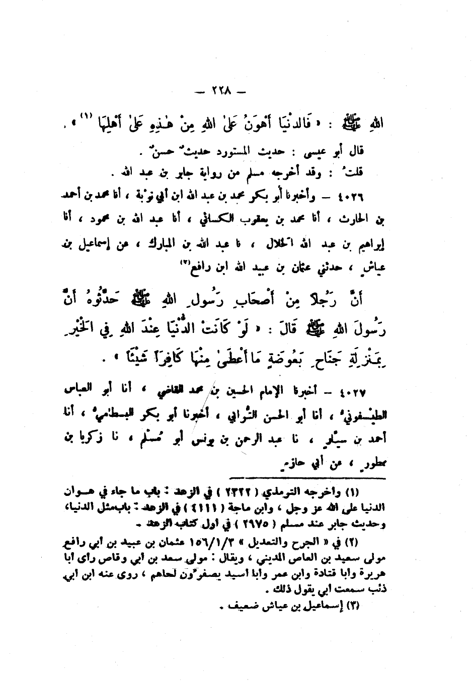 4026 - وَأَخْبَرَنَا أَبُو بَكْرٍ مُحَمَّدُ بْنُ عَبْدِ اللَّهِ بْنِ أَبِي تَوْبَةَ، أَنَا مُحَمَّدُ بْنُ أَحْمَدَ بْنِ الْحَارِثِ، أَنَا مُحَمَّدُ بْنُ يَعْقُوبَ الْكِسَائِيُّ، أَنَا عَبْدُ اللَّهِ بْنُ مَحْمُودٍ، أَنَا إِبْرَاهِيمُ بْنُ عَبْدِ اللَّهِ الْخَلالُ، نَا عَبْدُ اللَّهِ بْنُ الْمُبَارَكِ، عَنْ إِسْمَاعِيلَ بْنِ عَيَّاشٍ، حَدَّثَنِي عُثْمَانُ بْنُ عُبَيْدِ اللَّهِ بْنِ رَافِعٍ، أَنَّ رَجُلا مِنْ أَصْحَابِ رَسُولِ اللَّهِ صَلَّى اللهُ عَلَيْهِ وَسَلَّمَ حَدَّثُوهُ , أَنَّ رَسُولَ اللَّهِ صَلَّى اللهُ عَلَيْهِ وَسَلَّمَ قَالَ: «لَوْ كَانَتِ الدُّنْيَا عِنْدَ اللَّهِ فِي الْخَيْرِ بِمَنْزِلَةِ جَنَاحِ بَعُوضَةٍ، مَا أَعْطَى مِنْهَا كَافِرًا شَيْئًا»