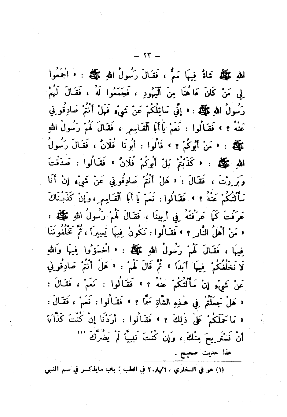 اللَّهِ صَلَّى اللهُ عَلَيْهِ وَسَلَّمَ شَاةٌ فِيهَا سُمٌّ، فَقَالَ رَسُولُ اللَّهِ صَلَّى اللهُ عَلَيْهِ وَسَلَّمَ: «اجْمَعُوا لِي مَنْ كَانَ ههُنَا مِنَ الْيَهُودِ»، فَجَمَعُوا لَهُ، فَقَالَ لَهُمْ رَسُولُ اللَّهِ صَلَّى اللهُ عَلَيْهِ وَسَلَّمَ: " إِنِّي سَائِلُكُمْ عَنْ شَيْءٍ فَهَلْ أَنْتُمْ صَادِقُونِي عَنْهُ؟ فَقَالُوا: نَعَمْ، يَا أَبَا الْقَاسِمِ، فَقَالَ لَهُمْ رَسُولُ اللَّهِ صَلَّى اللهُ عَلَيْهِ وَسَلَّمَ: «مَنْ أَبُوكُمْ»؟ قَالُوا: أَبُونَا فُلانٌ، فَقَالَ رَسُولُ اللَّهِ صَلَّى اللهُ عَلَيْهِ وَسَلَّمَ: «كَذَبْتُمْ بَلْ أَبُوكُمْ فُلانٌ»، فَقَالُوا: صَدَقْتَ وَبَرَرْتَ، فَقَالَ: «هَلْ أَنْتُمْ صَادِقُونِي عَنْ شَيْءٍ إِنْ أَنَا سَأَلْتُكُمْ عَنْهُ»؟ فَقَالُوا: نَعَمْ يَا أَبَا الْقَاسِمِ، وَإِنْ كَذَّبْنَاكَ عَرَفْتَ كَمَا عَرَفْتَهُ فِي أَبِينَا، فَقَالَ لَهُمْ رَسُولُ اللَّهِ صَلَّى اللهُ عَلَيْهِ وَسَلَّمَ: «مَنْ أَهْلُ النَّارِ»؟ فَقَالُوا: نَكُونُ فِيهَا يَسِيرًا، ثُمَّ تَخْلُفُونَنَا فِيهَا، فَقَالَ لَهُمْ رَسُولُ اللَّهِ صَلَّى اللهُ عَلَيْهِ وَسَلَّمَ: «اخْسَئُوا فِيهَا وَاللَّهِ لَا نَخْلُفُكُمْ فِيهَا أَبَدًا»، ثُمَّ قَالَ لَهُمْ: «هَلْ أَنْتُمْ صَادِقُونِي عَنْ شَيْءٍ إِنْ سَأَلْتُكُمْ عَنْهُ»؟ فَقَالُوا: نَعَمْ، فَقَالَ: «هَلْ جَعَلْتُمْ فِي هَذِهِ الشَّاةِ سُمًّا»؟ فَقَالُوا: نَعَمْ، فَقَالَ: «مَا حَمَلَكُمْ عَلَى ذَلِكَ»؟ فَقَالُوا: أَرَدْنَا إِنْ كُنْتَ كَذَّابًا أَنْ نَسْتَرِيحَ مِنْكَ، وَإِنْ كُنْتَ نَبِيًّا لَمْ يَضُرَّكَ.