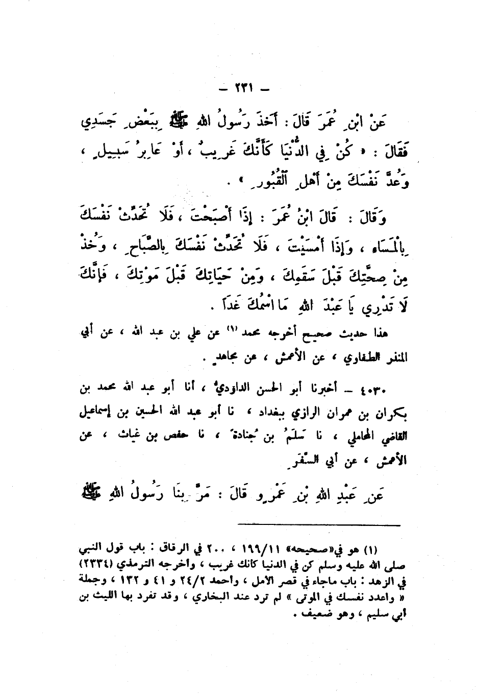 عَنِ ابْنِ عُمَرَ، قَالَ: أَخَذَ رَسُولُ اللَّهِ صَلَّى اللهُ عَلَيْهِ وَسَلَّمَ بِبَعْضِ جَسَدِي، فَقَالَ: «كُنْ فِي الدُّنْيَا كَأَنَّكَ غَرِيبٌ، أَوْ عَابِرُ سَبِيلٍ، وَعُدَّ نَفْسَكَ مِنْ أَهْلِ الْقُبُورِ» , وَقَالَ: قَالَ ابْنُ عُمَرَ: إِذَا أَصْبَحْتَ، فَلا تُحَدِّثْ نَفْسَكَ بِالْمَسَاءِ، وَإِذَا أَمْسَيْتَ، فَلا تُحَدِّثْ نَفْسَكَ بِالصَّبَاحِ، وَخُذْ مِنْ صِحَّتِكَ قَبْلَ سَقَمِكَ، وَمِنْ حَيَاتِكَ قَبْلَ مَوْتِكَ، فَإِنَّكَ لَا تَدْرِي يَا عَبْدَ اللَّهِ مَا اسْمُكَ غَدًا.