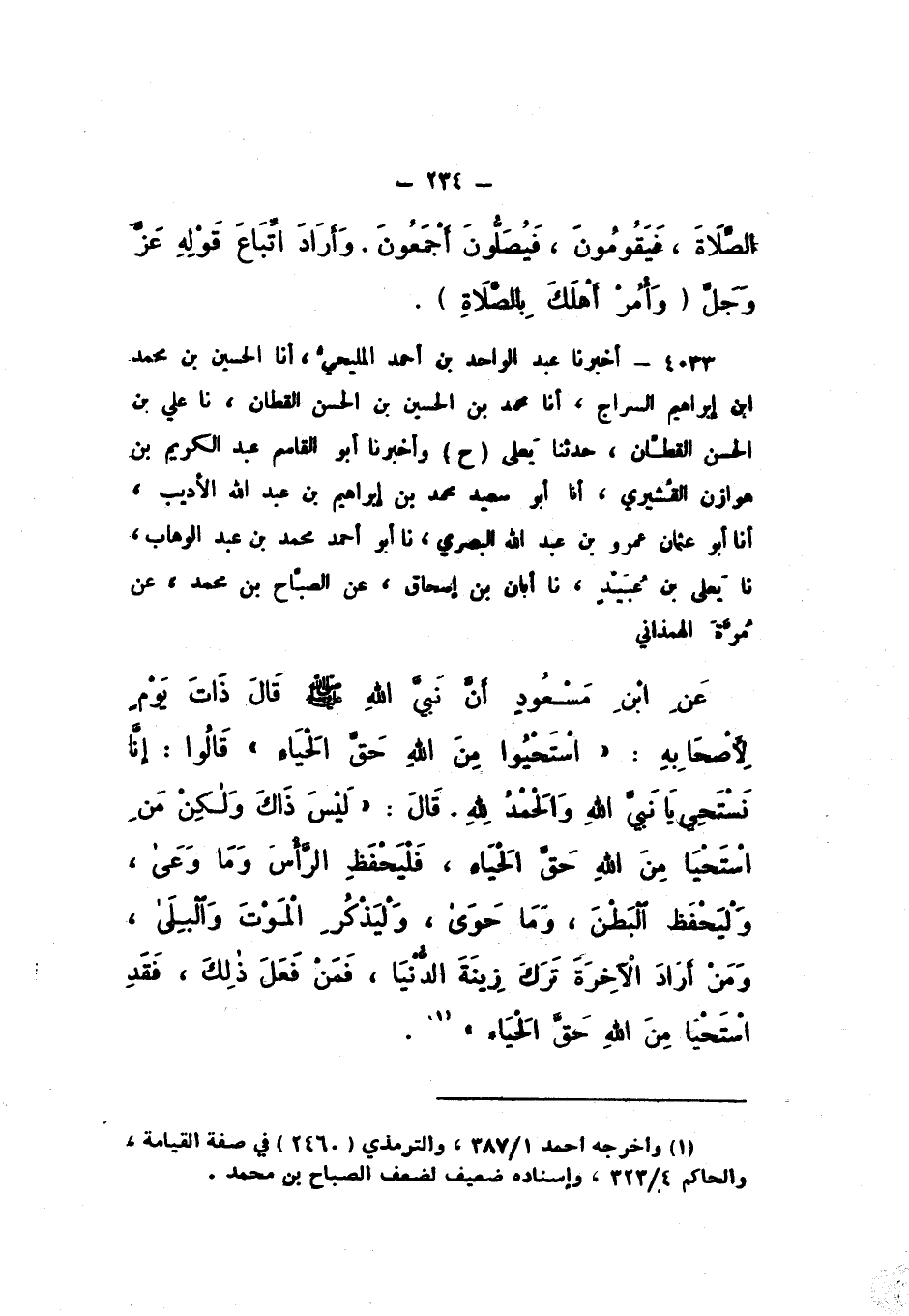 ح وَأَخْبَرَنَا أَبُو الْقَاسِمِ عَبْدُ الْكَرِيمِ بْنُ هَوَازِنَ الْقُشَيْرِيُّ، أَنَا أَبُو سَعِيدٍ مُحَمَّدُ بْنُ إِبْرَاهِيمَ بْنِ عَبْدِ اللَّهِ الأَدِيبُ، أَنَا أَبُو عُثْمَانَ عَمْرُو بْنُ عَبْدِ اللَّهِ الْبَصْرِيُّ، نَا أَبُو أَحْمَدَ مُحَمَّدُ بْنُ عَبْدِ الْوَهَّابِ، نَا يَعْلَى بْنُ عُبَيْدٍ، نَا أَبَانُ بْنُ إِسْحَاقَ، عَنِ الصَّبَّاحِ بْنِ مُحَمَّدٍ، عَنْ مُرَّةَ الْهَمَذَانِيِّ، عَنِ ابْنِ مَسْعُودٍ، أَنَّ نَبِيَّ اللَّه صَلَّى اللهُ عَلَيْهِ وَسَلَّمَ قَالَ ذَاتَ يَوْمٍ لأَصْحَابِهِ: «اسْتَحْيُوا مِنَ اللَّهِ حَقَّ الْحَيَاءِ»، قَالُوا: إِنَّا نَسْتَحِي يَا نَبِيَّ اللَّهِ، وَالْحَمْدُ لِلَّهِ، قَالَ: «لَيْسَ ذَاكَ وَلَكِنْ مَنِ اسْتَحْيَا مِنَ اللَّهِ حَقَّ الْحَيَاءِ، فَلْيَحْفَظِ الرَّأْسَ وَمَا وَعَى، وَلْيَحْفَظِ الْبَطْنَ، وَمَا حَوَى، وَلْيَذْكُرِ الْمَوْتَ وَالْبِلَى، وَمَنْ أَرَادَ الآخِرَةَ تَرَكَ زِينَةَ الدُّنْيَا، فَمَنْ فَعَلَ ذَلِكَ، فَقَدِ اسْتَحْيَا مِنَ اللَّهِ حَقَّ الْحَيَاءِ».