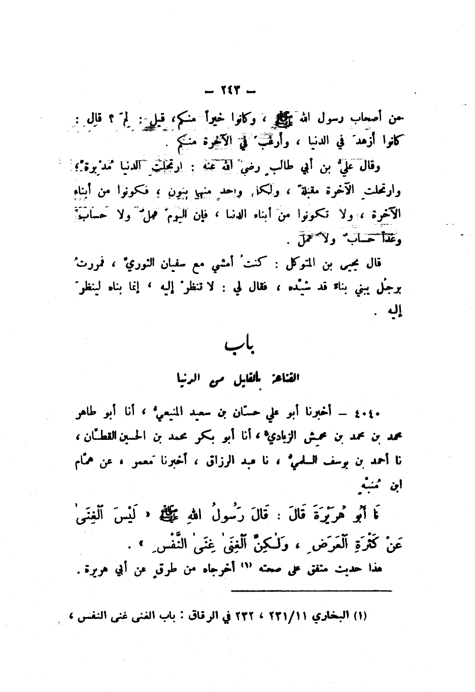 مِنْ أَصْحَابِ رَسُولِ اللَّهِ صَلَّى اللهُ عَلَيْهِ وَسَلَّمَ وَكَانُوا خَيْرًا مِنْكُمْ، قِيلَ: لِمَ؟ قَالَ: كَانُوا أَزْهَدَ فِي الدُّنْيَا، وَأَرْغَبَ فِي الآخِرَةِ مِنْكُمْ.