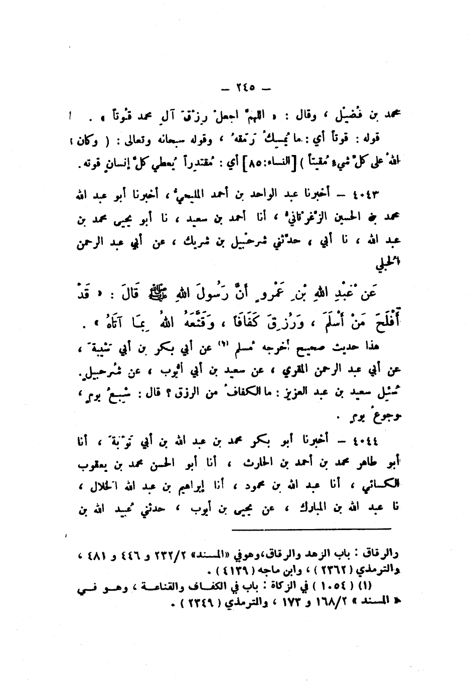 4043 - أَخْبَرَنَا عَبْدُ الْوَاحِدِ بْنُ أَحْمَدَ الْمَلِيحِيُّ، أَخْبَرَنَا أَبُو عَبْدِ اللَّهِ مُحَمَّدُ بْنُ الْحُسَيْنِ الزَّغَرْتَانِيُّ , أَنَا أَحْمَدُ بْنُ سَعِيدٍ، نَا أَبُو يَحْيَى مُحَمَّدُ بْنُ عَبْدِ اللَّهِ، نَا أَبِي، حَدَّثَنِي شُرَحْبِيلُ بْنُ شُرَيْكٍ، عَنْ أَبِي عَبْدِ الرَّحْمَنِ الْحَلَبِيِّ، عَنْ عَبْدِ اللَّهِ بْنِ عَمْرٍو، أَنّ رَسُولَ اللَّهِ صَلَّى اللهُ عَلَيْهِ وَسَلَّمَ قَالَ: «قَدْ أَفْلَحَ مَنْ أَسْلَمَ وَرُزِقَ كَفَافًا، وَقَنَعَهُ اللَّهُ بِمَا آتَاهُ».
