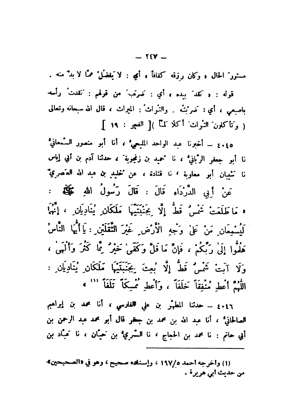 4045 - أَخْبَرَنَا عَبْدُ الْوَاحِدِ الْمَلِيحِيُّ، أَنَا أَبُو مَنْصُورٍ السَّمْعَانِيُّ، نَا أَبُو جَعْفَرٍ الرَّيَّانِيُّ، نَا حُمَيْدُ بْنُ زَنْجُوَيْهِ، حَدَّثَنَا آدَمُ بْنُ أَبِي إِيَاسٍ، نَا شَيْبَانُ أَبُو مُعَاوِيَةَ، نَا قَتَادَةُ، عَنْ خُلَيْدِ بْنِ عَبْدِ اللَّهِ الْعَصَرِيّ، عَنْ أَبِي الدَّرْدَاءِ، قَالَ: قَالَ رَسُولُ اللَّهِ صَلَّى اللهُ عَلَيْهِ وَسَلَّمَ: " مَا طَلَعَتْ شَمْسٌ قَطُّ إِلا بِجَنْبَتَيْهَا مَلَكَانِ يُنَادِيَانِ، إِنَّهُمَا لَيُسْمِعَانِ مَنْ عَلَى وَجْهِ الأَرْضِ غَيْرَ الثَّقَلَيْنِ: يَأَيُّهَا النَّاسُ، هَلُمُّوا إِلَى رَبِّكُمْ، فَإِنَّ مَا قَلَّ وَكَفَى خَيْرٌ مِمَّا كَثُرَ وَأَلْهَى، وَلا آبَتْ شَمْسٌ قَطُّ إِلا بُعِثَ بِجَنْبَتَيْهَا مَلَكَانِ يُنَادِيَانِ: اللَّهُمَّ أَعْطِ مُنْفِقًا خَلَفًا، وَأَعْطِ مُمْسِكًا تَلَفًا "