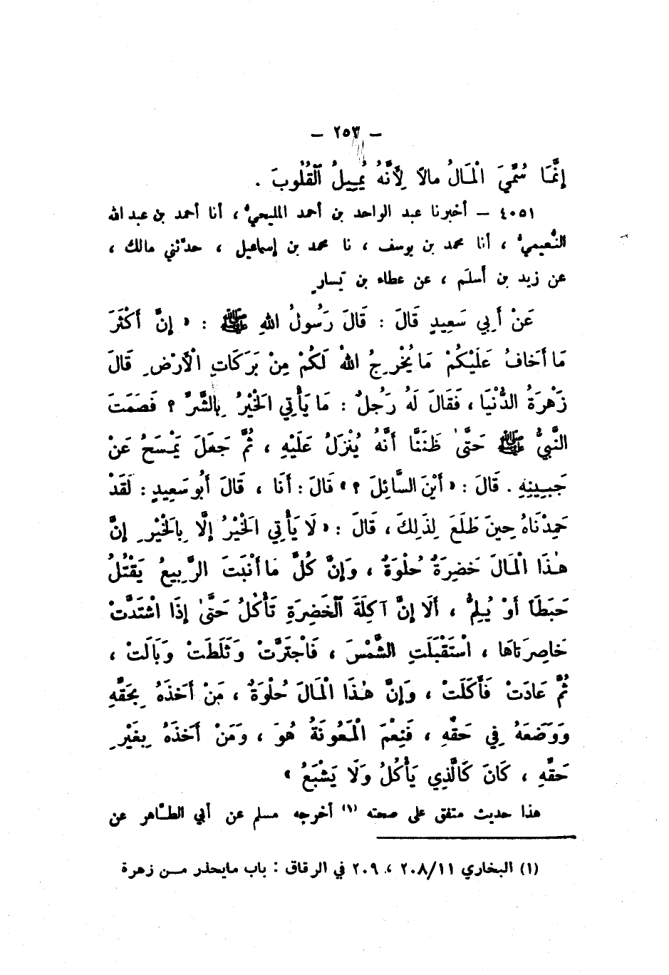 4051 - أَخْبَرَنَا عَبْدُ الْوَاحِدِ بْنُ أَحْمَدَ الْمَلِيحِيُّ، أَنَا أَحْمَدُ بْنُ عَبْدِ اللَّهِ النُّعَيْمِيُّ، أَنَا مُحَمَّدُ بْنُ يُوسُفَ، نَا مُحَمَّدُ بْنُ إِسْمَاعِيلَ، حَدَّثَنِي مَالِكٌ، عَنْ زَيْدِ بْنِ أَسْلَمَ، عَنْ عَطَاءِ بْنِ يَسَارٍ، عَنْ أَبِي سَعِيدٍ، قَالَ: قَالَ رَسُولُ اللَّهِ صَلَّى اللهُ عَلَيْهِ وَسَلَّمَ: " إِنَّ أَكْثَرَ مَا أَخَافُ عَلَيْكُمْ مَا يُخْرِجُ اللَّهُ لَكُمْ مِنْ بَرَكَاتِ الأَرْضِ، قَالَ: زَهْرَةُ الدُّنْيَا "، فَقَالَ لَهُ رَجُلٌ: مَا يَأْتِي الْخَيْرُ بِالشَّرِّ؟ فَصَمَتَ النَّبِيُّ صَلَّى اللهُ عَلَيْهِ وَسَلَّمَ حَتَّى ظَنَنَّا أَنَّهُ يَنْزِلُ عَلَيْهِ، ثُمَّ جَعَلَ يَمْسَحُ عَنْ جَبِينِهِ، قَالَ: «أَيْنَ السَّائِلُ؟» قَالَ: أَنَا، قَالَ أَبُو سَعِيدٍ: لَقَدْ حَمِدْنَاهُ حِينَ طَلَعَ لِذَلِكَ، قَالَ: «لَا يَأْتِي الْخَيْرُ إِلا بِالْخَيْرِ إِنَّ هَذَا الْمَالُ خَضِرَةٌ حُلْوَةٌ، وَإِنَّ كُلَّ مَا أَنْبَتَ الرَّبِيعُ يَقْتُلُ حَبَطًا، أَوْ يُلِمُّ، أَلا إِنَّ آكِلَةَ الْخَضِرَةَ تَأْكُلُ حَتَّى إِذَا اشْتَدَّتْ خَاصِرَتَاهَا، اسْتَقْبَلَتِ الشَّمْسَ، فَاجْتَرَّتْ وَثَلَطَتْ وَبَالَتْ، ثُمَّ عَادَتْ فَأَكَلَتْ، وَإِنَّ هَذَا الْمَالَ حُلْوَةٌ، مَنْ أَخَذَهُ بِحَقِّهِ وَوَضَعَهُ فِي حَقِّهِ فَنِعْمَ الْمَعُونَةُ هُوَ، وَمَنْ أَخَذَهُ بِغَيْرِ حَقِّهِ، كَانَ كَالَّذِي يَأْكُلُ وَلا يَشْبَعُ».