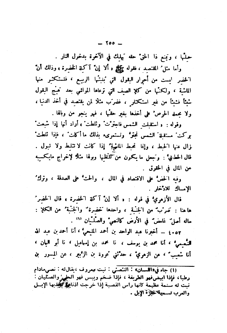 وَأَمَّا مَثَلُ الْمُقْتَصِدِ، فَقَوْلُهُ صَلَّى اللهُ عَلَيْهِ وَسَلَّمَ: «أَلا إِنَّ آكِلَةَ الْخَضِرَةِ» وَذَلِكَ أَنَّ الْخَضِرَ لَيْسَتْ مِنْ أَحْرَارِ الْبُقُولِ الَّتِي يُنْبِتُهَا الرَّبِيعُ فَتَسْتَكْثِرُ مِنْهَا الْمَاشِيَةُ، وَلَكِنَّهَا مِنْ كَلأِ الصَّيْفِ الَّتِي تَرْعَاهَا الْمَوَاشِي بَعْدَ هَيْجِ الْبُقُولِ شَيْئًا فَشَيْئًا مِنْ غَيْرِ اسْتِكْثَارِ، فَضَرَبَ مَثَلا لِمَنْ يَقْتَصِدُ فِي أَخْذِ الدُّنْيَا وَلا يَحْمِلُهُ الْحَرْصِ عَلَى أَخْذِهَا بِغَيْرِ حَقِّهَا، فَهُوَ يَنْجُو مِنْ وَبَالِهَا.