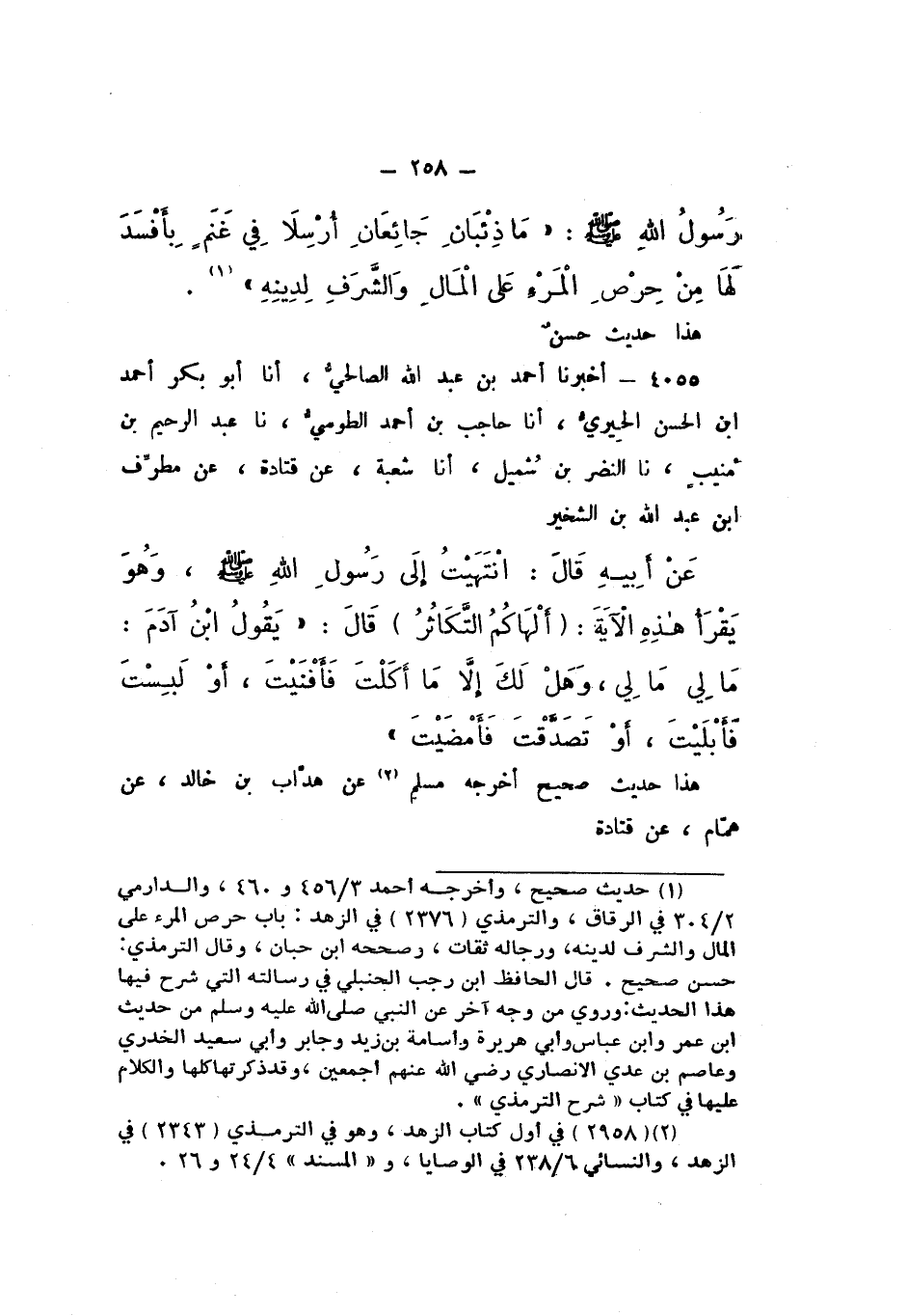 4055 - أَخْبَرَنَا أَحْمَدُ بْنُ عَبْدِ اللَّهِ الصَّالِحِيُّ، أَنَا أَبُو بَكْرٍ أَحْمَدُ بْنُ الْحَسَنِ الْحِيرِيُّ، أَنَا حَاجِبُ بْنُ أَحْمَدَ الطُّوسِيُّ، نَا عَبْدُ الرَّحِيمِ بْنُ مُنِيبٍ، نَا النَّضْرُ بْنُ شُمَيْلٍ، أَنَا شُعْبَةُ، عَنْ قَتَادَةَ، عَنْ مُطَرِّفِ بْنِ عَبْدِ اللَّهِ بْنِ الشِّخِّيرِ، عَنْ أَبِيهِ، قَالَ: انْتَهَيْتُ إِلَى رَسُولِ اللَّهِ صَلَّى اللهُ عَلَيْهِ وَسَلَّمَ وَهُوَ يَقْرَأُ هَذِهِ: {أَلْهَاكُمُ التَّكَاثُرُ} [التكاثر: 1]، قَالَ: " يَقُولُ ابْنُ آدَمَ: مَالِي مَالِي، وَهَلْ لَكَ إِلا مَا أَكَلْتَ فَأَفْنَيْتَ، أَوْ لَبِسْتَ فَأَبْلَيْتَ، أَوْ تَصَدَّقْتَ فَأَمْضَيْتَ ".