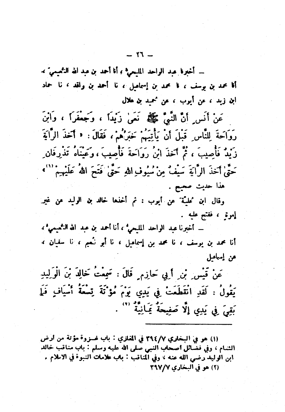 أَخْبَرَنَا عَبْدُ الْوَاحِدِ الْمَلِيحِيُّ، أَنَا أَحْمَدُ بْنُ عَبْدِ اللَّهِ النُّعَيْمِيُّ، أَنَا مُحَمَّدُ بْنُ يُوسُفَ، نَا مُحَمَّدُ بْنُ إِسْمَاعِيلَ، نَا أَحْمَدُ بْنُ وَاقِدٍ، نَا حَمَّادُ بْنُ زَيْدٍ، عَنْ أَيُّوبَ، عَنْ حُمَيْدِ بْنِ هِلالٍ، عَنْ أَنَسٍ، أَنّ النَّبِيَّ صَلَّى اللهُ عَلَيْهِ وَسَلَّمَ نَعَى زَيْدًا، وَجَعْفَرًا، وَابْنَ رَوَاحَةَ لِلنَّاسِ قَبْلَ أَنْ يَأْتِيَهُمْ خَبَرُهُمْ، فَقَالَ: «أَخَذَ الرَّايَةَ زَيْدٌ، فَأُصِيبَ، ثُمَّ أَخَذَ ابْنُ رَوَاحَةَ، فَأُصِيبَ، وَعَيْنَاهُ تَذْرِفَانِ حَتَّى أَخَذَ الرَّايَةَ سَيْفٌ مِنْ سُيُوفِ اللَّهِ حَتَّى فَتَحَ اللَّهُ عَلَيْهِمْ».