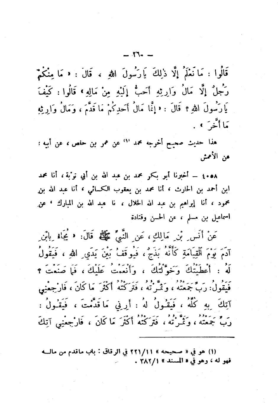 قَالُوا: مَا نَعْلَمُ إِلا ذَلِكَ يَا رَسُولَ اللَّهِ؟ قَالَ: «مَا مِنْكُمْ رَجُلٌ إِلا مَالُ وَارِثِهِ أَحَبُّ إِلَيْهِ مِنْ مَالِهِ» قَالُوا: كَيْفَ يَا رَسُولَ اللَّهِ؟ إِنَّمَا مَالُ أَحَدِكُمْ مَا قَدَّمَ، وَمَالُ وَارِثِهِ مَا أَخَّرَ ".