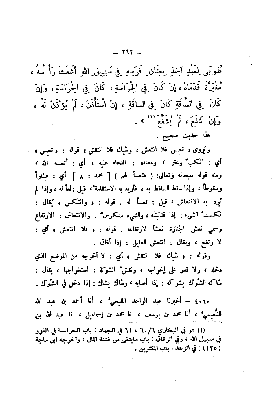 طُوبَى لِعَبْدٍ آخِذٍ بِعِنَانِ فَرَسِهِ فِي سَبِيلِ اللَّهِ أَشْعَثَ رَأْسُهُ، مُغْبَرَّةً قَدَمَاهُ، إِنْ كَانَ فِي الْحِرَاسَةِ، كَانَ فِي الْحِرَاسَةِ، وَإِنْ كَانَ فِي السَّاقَةِ كَانَ فِي السَّاقَةِ، إِنِ اسْتَأْذَنَ، لَمْ يُؤْذَنْ لَهُ، وَإِنْ شَفَعَ، لَمْ يُشَفَّعْ».