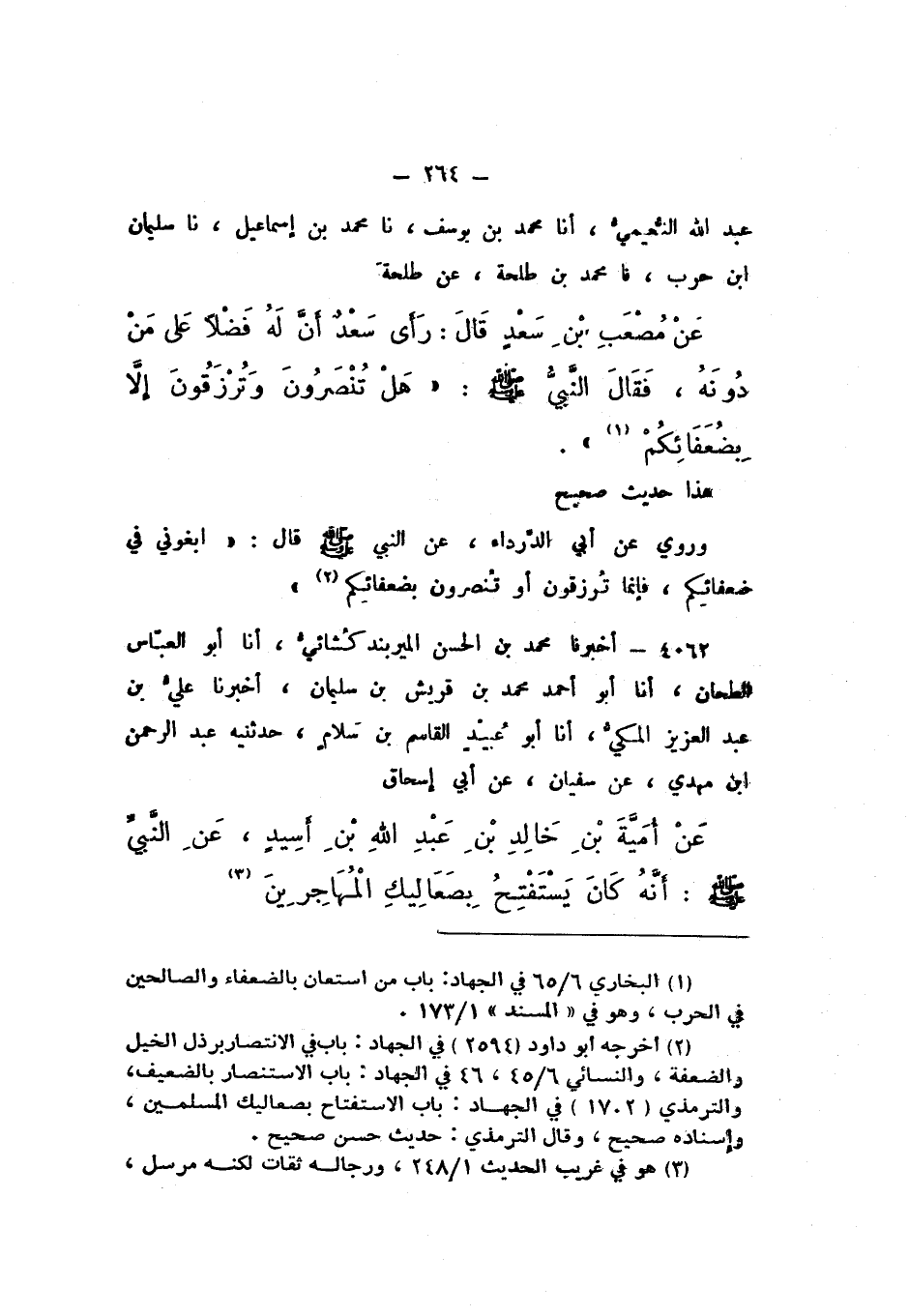 عَبْدِ اللَّهِ النُّعَيْمِيُّ، أَنَا مُحَمَّدُ بْنُ يُوسُفَ، نَا مُحَمَّدُ بْنُ إِسْمَاعِيلَ، نَا سُلَيْمَانُ بْنُ حَرْبٍ، نَا مُحَمَّدُ بْنُ طَلْحَةَ، عَنْ طَلْحَةَ، عَنْ مُصْعَبِ بْنِ سَعْدٍ، قَالَ: رَأَى سَعْدٌ أَنَّ لَهُ فَضْلا عَلَى مَنْ دُونِهِ، فَقَالَ النَّبِيُّ صَلَّى اللهُ عَلَيْهِ وَسَلَّمَ: «هَلْ تُنْصَرُونَ وَتُرْزَقُونَ إِلا بِضُعَفَائِكُمْ».