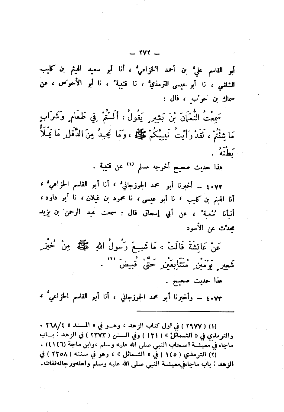 أَبُو الْقَاسِمِ عَلِيُّ بْنُ أَحْمَدَ الْخُزَاعِيُّ، أَنَا أَبُو سَعِيدٍ الْهَيْثَمُ بْنُ كُلَيْبٍ الشَّاشِيُّ، نَا أَبُو عِيسَى التِّرْمِذِيُّ، نَا قُتَيْبَةُ، نَا أَبُو الأَحْوَصِ، عَنْ سِمَاكِ بْنِ حَرْبٍ، قَالَ: سَمِعْتُ النُّعْمَانَ بْنَ بَشِيرٍ، يَقُولُ: «أَلَسْتُمْ فِي طَعَامٍ وَشَرَابٍ مَا شِئْتُمْ؟ لَقَدْ رَأَيْتُ نَبِيَّكُمْ صَلَّى اللهُ عَلَيْهِ وَسَلَّمَ وَمَا يَجِدُ مِنَ الدَّقَلِ مَا يَمْلأُ بَطْنَهُ».