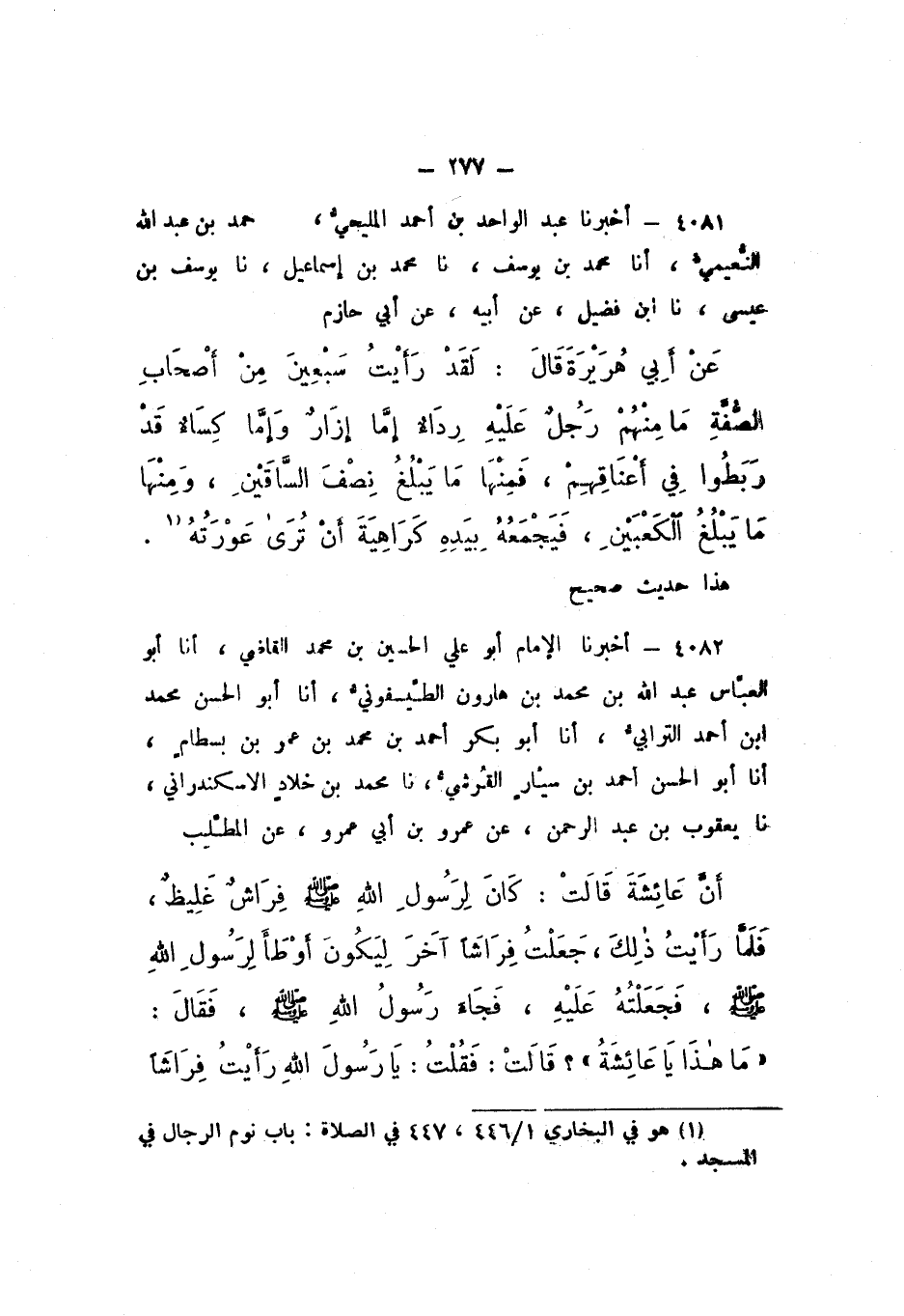4081 - أَخْبَرَنَا عَبْدُ الْوَاحِدِ بْنُ أَحْمَدَ الْمَلِيحِيُّ، أَنَا أَحْمَدُ بْنُ عَبْدِ اللَّهِ النُّعَيْمِيُّ، أَنَا مُحَمَّدُ بْنُ يُوسُفَ، نَا مُحَمَّدُ بْنُ إِسْمَاعِيلَ، نَا يُوسُفُ بْنُ عِيسَى، نَا ابْنُ فُضَيْلٍ، عَنْ أَبِيهِ، عَنْ أَبِي حَازِمٍ، عَنْ أَبِي هُرَيْرَةَ، قَالَ: «لَقَدْ رَأَيْتُ سَبْعِينَ مِنْ أَصْحَابِ الصُّفَّةِ مَا مِنْهُمْ رَجُلٌ عَلَيْهِ رِدَاءٌ إِمَّا إِزَارٌ، وَإِمَّا كِسَاءٌ، قَدْ رَبَطُوا فِي أَعْنَاقِهِمْ، فَمِنْهَا مَا يَبْلُغُ نِصْفَ السَّاقَيْنِ، وَمِنْهَا مَا يَبْلُغُ الْكَعْبَيْنِ، فَيَجْمَعُهُ بِيَدِهِ كَرَاهِيَةَ أَنْ تُرَى عَوْرَتَهُ».