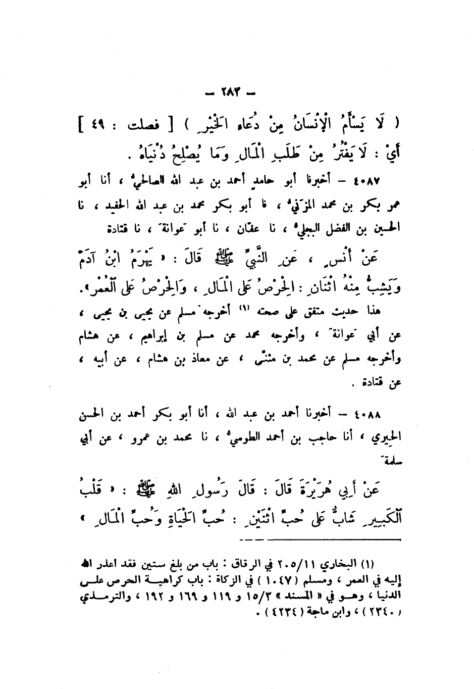 4087 - أَخْبَرَنَا أَبُو حَامِدٍ أَحْمَدُ بْنُ عَبْدِ اللَّهِ الصَّالِحِيُّ، أَنَا أَبُو عُمَرَ بَكْرُ بْنُ مُحَمَّدٍ الْمُزَنِيُّ، نَا أَبُو بَكْرٍ مُحَمَّدُ بْنُ عَبْدِ اللَّهِ الْحَفِيدُ، نَا الْحُسَيْنُ بْنُ الْفَضْلِ الْبَجَلِيُّ، نَا عَفَّانُ، نَا أَبُو عَوَانَةَ، نَا قَتَادَةُ، عَنْ أَنَسٍ، عَنِ النَّبِيِّ صَلَّى اللهُ عَلَيْهِ وَسَلَّمَ قَالَ: " يَهْرَمُ ابْنُ آدَمَ وَيَشُبُّ مِنْهُ اثْنَانِ: الْحِرْصُ عَلَى الْمَالِ، وَالْحِرْصُ عَلَى الْعُمُرِ ".