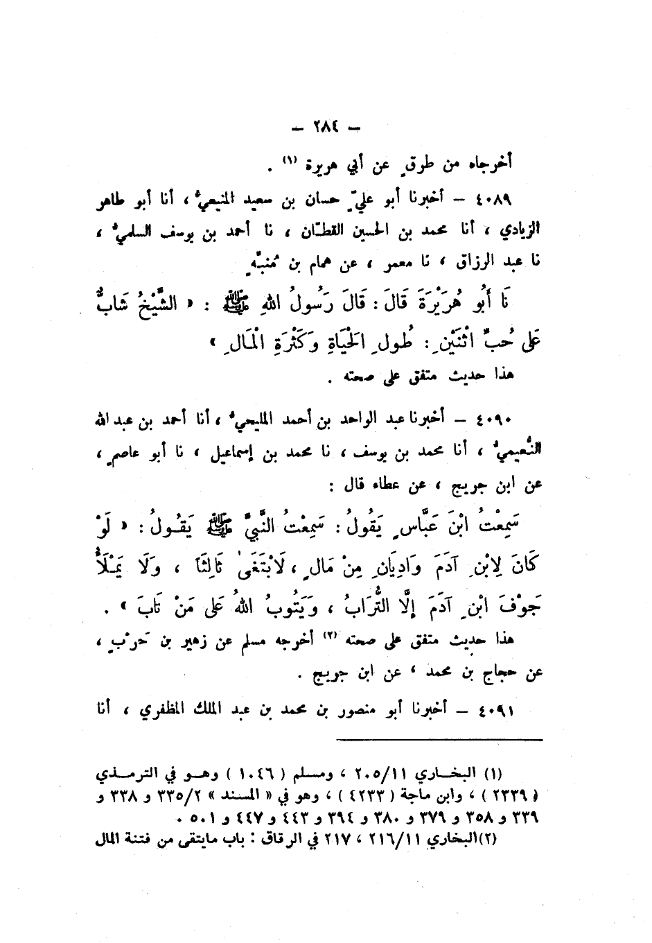 4089 - أَخْبَرَنَا أَبُو عَلِيٍّ حَسَّانُ بْنُ سَعِيدٍ الْمَنِيعِيُّ، أَنَا أَبُو طَاهِرٍ الزِّيَادِيُّ، أَنَا مُحَمَّدُ بْنُ الْحُسَيْنِ الْقَطَّانُ، نَا أَحْمَدُ بْنُ يُوسُفَ السُّلَمِيُّ، نَا عَبْدُ الرَّزَّاقِ، نَا مَعْمَرٌ، عَنْ هَمَّامِ بْنِ مُنَبِّهٍ، نَا أَبُو هُرَيْرَةَ، قَالَ: قَالَ رَسُولُ اللَّهِ صَلَّى اللهُ عَلَيْهِ وَسَلَّمَ: " الشَّيْخُ شَابٌّ عَلَى حُبِّ اثْنَيْنِ: طُولِ الْحَيَاةِ، وَكَثْرَةِ الْمَالِ ".