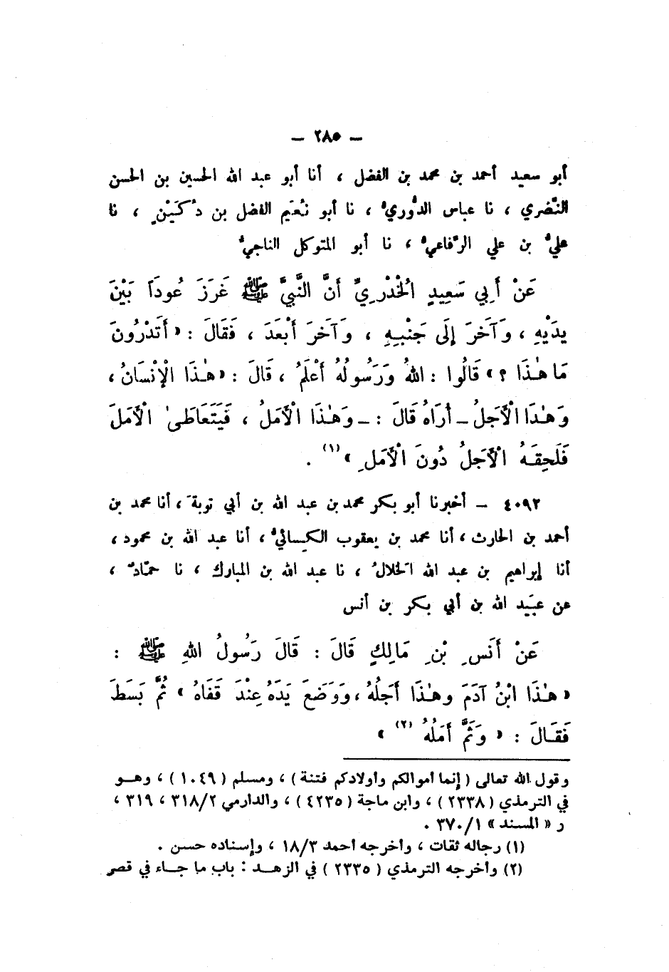 أَبُو سَعِيدٍ أَحْمَدُ بْنُ مُحَمَّدِ بْنِ الْفَضْلِ، أَنَا أَبُو عَبْدِ اللَّهِ الْحُسَيْنُ بْنُ الْحَسَنِ النَّضْرِيُّ، نَا عَبَّاسُ الدُّورِيُّ، نَا أَبُو نُعَيْمٍ الْفَضْلُ بْنُ دُكَيْنٍ، نَا عَلِيُّ بْنُ عَلِيٍّ الرِّفَاعِيُّ، نَا أَبُو الْمُتَوَكِّلِ النَّاجِي، عَنْ أَبِي سَعِيدٍ الْخُدْرِيِّ، أَنّ النَّبِيَّ صَلَّى اللهُ عَلَيْهِ وَسَلَّمَ غَرَزَ عُودًا بَيْنَ يَدَيْهِ، وَآخَرَ إِلَى جَنْبِهِ، وَآخَرَ أَبْعَدَ، فَقَالَ: «أَتَدْرُونَ مَا هَذَا؟» قَالُوا: اللَّهُ وَرَسُولُهُ أَعْلَمُ، قَالَ: «هَذَا الإِنْسَانُ، وَهَذَا الأَجَلُ أَرَاهُ قَالَ وَهَذَا الأَمَلُ، فَيَتَعَاطَى الأَمَلَ فَلَحِقَهُ الأَجَلُ دُونَ الأَمَلِ»