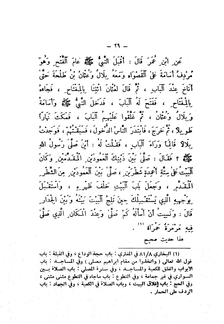 عَنِ ابْنِ عُمَرَ، قَالَ: " أَقْبَلَ النَّبِيُّ صَلَّى اللهُ عَلَيْهِ وَسَلَّمَ عَامَ الْفَتْحِ وَهُوَ مُرْدِفٌ أُسَامَةَ عَلَى الْقَصْوَاءِ، وَمَعَهُ بِلالٌ، وَعُثْمَانُ بْنُ طَلْحَةَ، حَتَّى أَنَاخَ عِنْدَ الْبَابِ، ثُمَّ قَالَ لِعُثْمَانَ: ائْتِنَا بِالْمِفْتَاحِ، فَجَاءَهُ بِالْمِفْتَاحِ، فَفَتَحَ لَهُ الْبَابَ، فَدَخَلَ النَّبِيُّ صَلَّى اللهُ عَلَيْهِ وَسَلَّمَ وَأُسَامَةُ، وَبِلالٌ، وَعُثْمَانُ، ثُمَّ غَلَّقُوا عَلَيْهِمُ الْبَابَ، فَمَكَثَ نَهَارًا طَوِيلا ثُمَّ خَرَجَ "، فَابْتَدَرَ النَّاسُ الدُّخُولَ، فَسَبقْتُهُمْ، فَوَجَدْتُ بِلالا قَائِمًا وَرَاءَ الْبَابِ، فَقُلْتُ لَهُ: أَيْنَ صَلَّى رَسُولُ اللَّهِ صَلَّى اللهُ عَلَيْهِ وَسَلَّمَ؟ فَقَالَ: «صَلَّى بَيْنَ ذَيْنِكَ الْعَمُودَيْنِ الْمُقَدَّمَيْنِ، وَكَانَ الْبَيْتُ عَلَى سِتَّةِ أَعْمِدَةٍ شَطْرَيْنِ، صَلَّى بَيْنَ الْعَمُودَيْنِ مِنَ الشَّطْرِ الْمُقَدَّمِ، وَجَعَلَ بَابَ الْبَيْتِ خَلْفَ ظَهْرِهِ، وَاسْتَقْبَلَ بِوَجْهِهِ الَّذِي يَسْتَقْبِلُكَ حِينَ تَلِجَ الْبَيْتَ بَيْنَهُ وَبَيْنَ الْجِدَارِ»، قَالَ: وَنَسِيتُ أَنْ أَسْأَلَهُ كَمْ صَلَّى، وَعِنْدَ الْمَكَانِ الَّذِي صَلَّى فِيهِ مَرْمَرَةٌ حَمْرَاءَ.