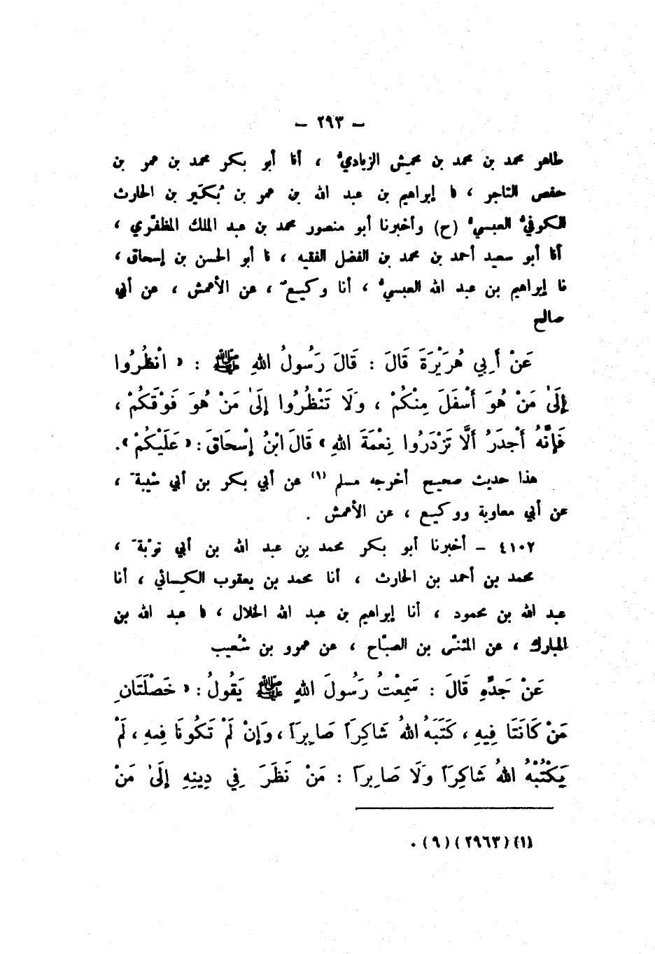 ح وَأَخْبَرَنَا أَبُو مَنْصُورٍ مُحَمَّدُ بْنُ عَبْدِ الْمَلِكِ الْمُظَفَّرِيُّ، أَنَا أَبُو سَعِيدٍ أَحْمَدُ بْنُ مُحَمَّدِ بْنِ الْفَضْلِ الْفَقِيهُ، نَا أَبُو الْحَسَنِ بْنُ إِسْحَاقَ، نَا إِبْرَاهِيمُ بْنُ عَبْدِ اللَّهِ الْعَبْسِيُّ، أَنَا وَكِيعٌ، عَنِ الأَعْمَشِ، عَنْ أَبِي صَالِحٍ، عَنْ أَبِي هُرَيْرَةَ، قَالَ: قَالَ رَسُولُ اللَّهِ صَلَّى اللهُ عَلَيْهِ وَسَلَّمَ: «انْظُرُوا عَلَى مَنْ هُوَ أَسْفَلُ مِنْكُمْ، وَلا تَنْظُرُوا إِلَى مَنْ هُوَ فَوْقَكُمْ، فَإِنَّهُ أَجْدَرُ أَلا تَزْدَرُوا نِعْمَةَ اللَّهِ»، قَالَ ابْنُ إِسْحَاقَ: «عَلَيْكُمْ».