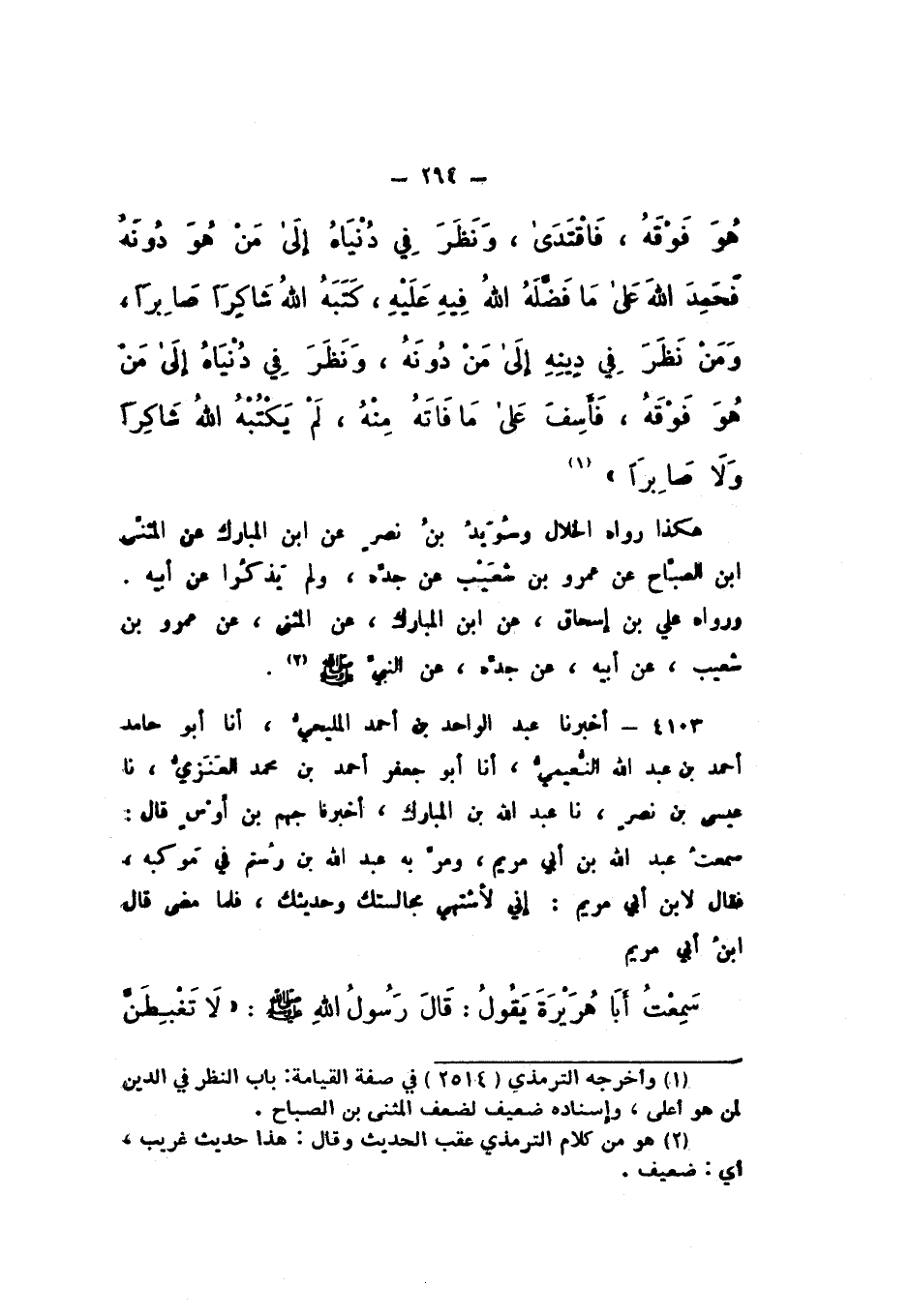 4103 - أَخْبَرَنَا عَبْدُ الْوَاحِدِ بْنُ أَحْمَدَ الْمَلِيحِيُّ، أَنَا أَبُو حَامِدٍ أَحْمَدُ بْنُ عَبْدِ اللَّهِ النُّعَيْمِيُّ، أَنَا أَبُو جَعْفَرٍ أَحْمَدُ بْنُ مُحَمَّدٍ الْعَنَزِيُّ، نَا عِيسَى بْنُ نَصْرٍ، نَا عَبْدُ اللَّهِ بْنُ الْمُبَارَكِ، أَخْبَرَنَا جَهْمُ بْنُ أَوْسٍ، قَالَ: سَمِعْتُ عَبْدَ اللَّهِ بْنَ أَبِي مَرْيَمَ، وَمَرَّ بِهِ عَبْدُ اللَّهِ بْنُ رُسْتُمَ فِي مَوْكِبِهِ، فَقَالَ لابْنِ أَبِي مَرْيَمَ: إِنِّي لأَشْتَهِي مُجَالَسَتَكَ وَحَدِيثَكَ، فَلَمَّا مَضَى، قَالَ ابْنُ أَبِي مَرْيَمَ سَمِعْتُ أَبَا هُرَيْرَةَ، يَقُولُ: قَالَ رَسُولُ اللَّهِ صَلَّى اللهُ عَلَيْهِ وَسَلَّمَ: «لَا تَغْبِطَنَّ