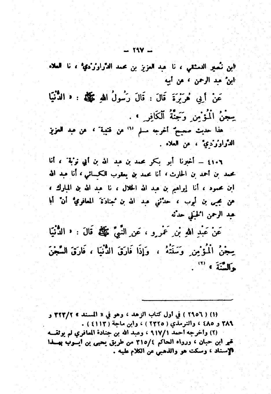 بْنِ نُصَيْرٍ الدِّمَشْقِيُّ، نَا عَبْدُ الْعَزِيزِ بْنُ مُحَمَّدٍ الدَّرَاوَرْدِيُّ، نَا الْعَلاءُ بْنُ عَبْدِ الرَّحْمَنِ، عَنْ أَبِيهِ، عَنْ أَبِي هُرَيْرَةَ، قَالَ: قَالَ رَسُولُ اللَّهِ صَلَّى اللهُ عَلَيْهِ وَسَلَّمَ: «الدُّنْيَا سِجْنُ الْمُؤْمِنُ وَجَنَّةُ الْكَافِرِ».