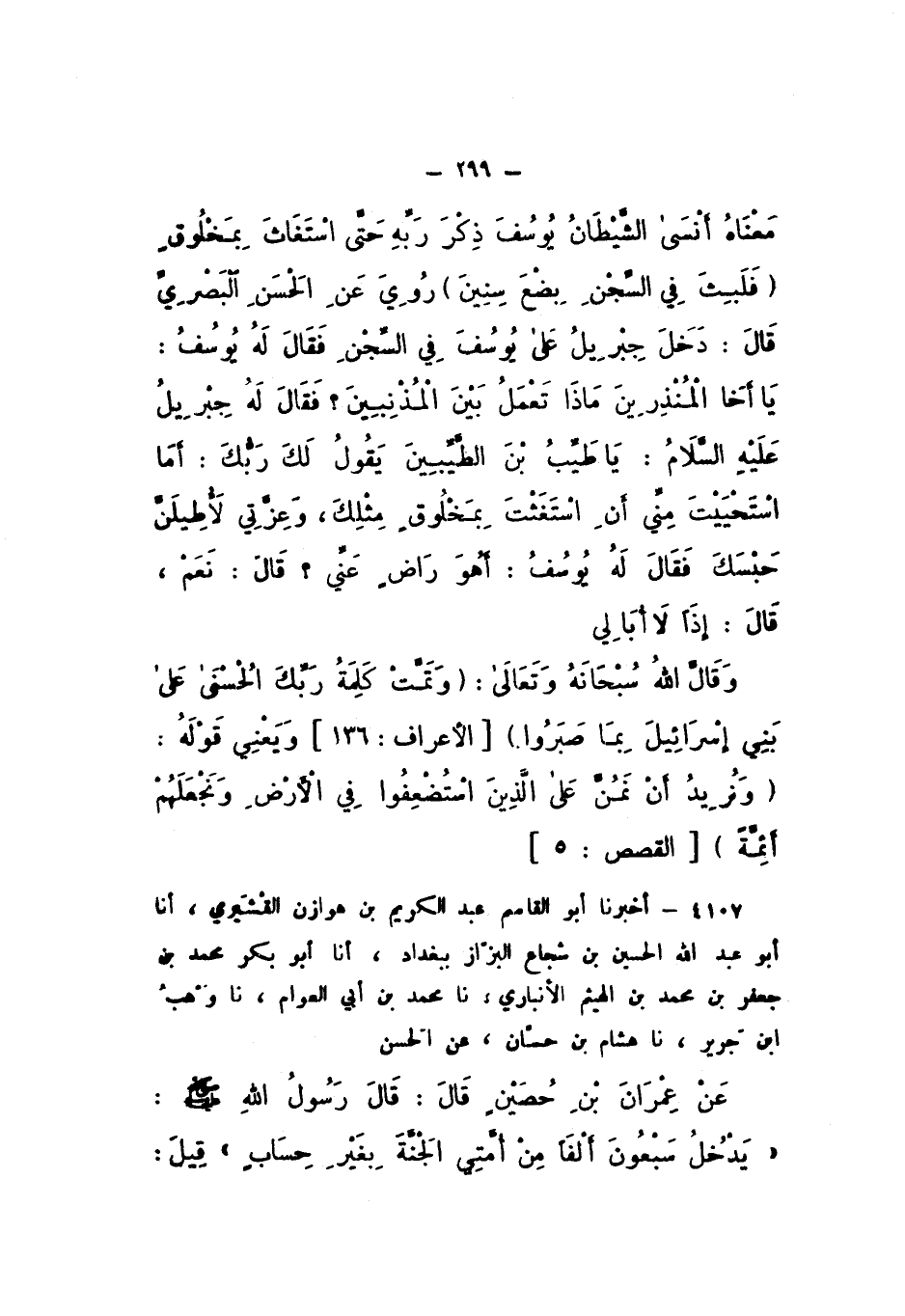 4107 - أَخْبَرَنَا أَبُو الْقَاسِمِ عَبْدُ الْكَرِيمِ بْنُ هَوَازِنَ الْقُشَيْرِيُّ، أَنَا أَبُو عَبْدِ اللَّهِ الْحُسَيْنُ بْنُ شُجَاعٍ الْبَزَّازُ، بِبَغْدَادَ، أَنَا أَبُو بَكْرٍ مُحَمَّدُ بْنُ جَعْفَرِ بْنِ مُحَمَّدِ بْنِ الْهَيْثَمِ الأَنْبَارِيُّ، نَا مُحَمَّدُ بْنُ أَبِي الْعَوَّامِ، نَا وَهْبُ بْنُ جَرِيرٍ، نَا هِشَامُ بْنُ حَسَّانٍ، عَنِ الْحَسَنِ، عَنْ عِمْرَانَ بْنِ حُصَيْنٍ، قَالَ: قَالَ رَسُولُ اللَّهِ صَلَّى اللهُ عَلَيْهِ وَسَلَّمَ: «يَدْخُلُ سَبْعُونَ أَلْفًا مِنْ أُمَّتِي الْجَنَّةَ بِغَيْرِ حِسَابٍ»، قِيلَ: