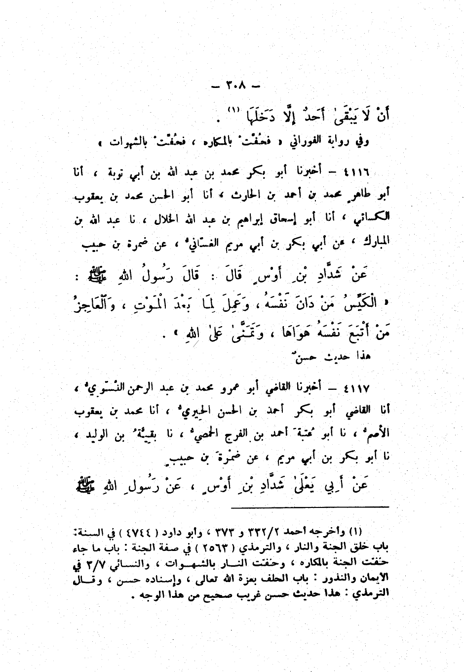 4116 - أَخْبَرَنَا أَبُو بَكْرٍ مُحَمَّدُ بْنُ عَبْدِ اللَّهِ بْنِ أَبِي تَوْبَةَ، أَنَا أَبُو طَاهِرٍ مُحَمَّدُ بْنُ أَحْمَدَ بْنِ الْحَارِثِ، أَنَا أَبُو الْحَسَنِ مُحَمَّدُ بْنُ يَعْقُوبَ الْكِسَائِيُّ، أَنَا أَبُو إِسْحَاقَ إِبْرَاهِيمُ بْنُ عَبْدِ اللَّهِ الْخَلالُ، نَا عَبْدُ اللَّهِ بْنُ الْمُبَارَكِ، عَنْ أَبِي بَكْرِ بْنِ أَبِي مَرْيَمَ الْغَسَّانِيِّ , عَنْ ضَمْرَةَ بْنِ حَبِيبٍ، عَنْ شَدَّادِ بْنِ أَوْسٍ، قَالَ: قَالَ رَسُولُ اللَّهِ صَلَّى اللهُ عَلَيْهِ وَسَلَّمَ: «الْكَيِّسُ مَنْ دَانَ نَفْسَهُ، وَعَمِلَ لِمَا بَعْدَ الْمَوْتِ، وَالْعَاجِزُ مَنِ أَتْبَعَ نَفْسَهُ هَوَاهَا، وَتَمَنَّى عَلَى اللَّهِ».