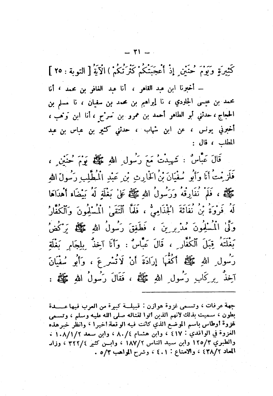 أَخْبَرَنَا ابنُ عَبْدِ الْقَاهِرِ، أَنَا عَبْدُ الْغَافِرِ بْنُ مُحَمَّدٍ، أَنَا مُحَمَّدُ بْنُ عِيسَى الْجُلُودِيُّ، نَا إِبْرَاهِيمُ بْنُ مُحَمَّدِ بْنِ سُفْيَانَ، نَا مُسْلِمُ بْنُ الْحَجَّاجِ، حَدَّثَنِي أَبُو الطَّاهِرِ أَحْمَدُ بْنُ عَمْرِو بْنِ سَرْحٍ، أَنَا ابْنُ وَهْبٍ، أَخْبَرَنِي يُونُسُ، عَنِ ابْنِ شِهَابٍ، حَدَّثَنِي كَثِيرُ بْنُ عَبَّاسِ بْنِ عَبْدِ الْمُطَّلِبِ، قَالَ: قَالَ عَبَّاسٌ: شَهِدْتُ مَعَ رَسُولِ اللَّهِ صَلَّى اللهُ عَلَيْهِ وَسَلَّمَ يَوْمَ حُنَيْنٍ، فَلَزِمْتُ أَنَا وَأَبُو سُفْيَانَ بْنُ الْحَارِثِ بْنِ عَبْدِ الْمُطَّلِبِ رَسُولَ اللَّهِ صَلَّى اللهُ عَلَيْهِ وَسَلَّمَ فَلَمْ نُفَارِقْهُ وَرَسُولُ اللَّهِ صَلَّى اللهُ عَلَيْهِ وَسَلَّمَ عَلَى بَغْلَةٍ لَهُ بَيْضَاءَ أَهْدَاهَا لَهُ فَرْوَةُ بْنُ نُفَاثَةَ الْجِذَامِيُّ، فَلَمَّا الْتَقَى الْمُسْلِمُونَ وَالْكُفَّارُ وَلَّى الْمُسْلِمُونَ مُدْبِرِينَ، فَطَفِقَ رَسُولُ اللَّهِ صَلَّى اللهُ عَلَيْهِ وَسَلَّمَ يُرْكِضُ بَغْلَتَهُ قِبَلَ الْكُفَّارِ، قَالَ عَبَّاسٌ: وَأَنَا آخِذٌ بِلِجَامِ بَغْلَةِ رَسُولِ اللَّهِ صَلَّى اللهُ عَلَيْهِ وَسَلَّمَ أَكُفَّهَا إِرَادَةَ أَنْ لَا تُسْرِعَ، وَأَبُو سُفْيَانَ آخِذٌ بِرِكَابِ رَسُولِ اللَّهِ صَلَّى اللهُ عَلَيْهِ وَسَلَّمَ فَقَالَ رَسُولُ اللَّهِ صَلَّى اللهُ عَلَيْهِ وَسَلَّمَ: «