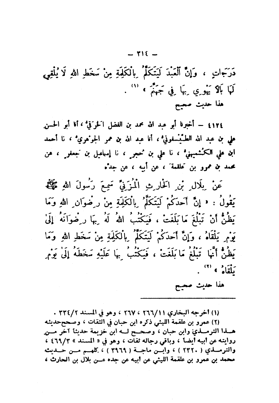 4124 - أَخْبَرَنَا أَبُو عَبْدِ اللَّهِ مُحَمَّدُ بْنُ الْفَضْلِ الْخِرَقِيُّ , أَنَا أَبُو الْحَسَنِ عَلِيُّ بْنُ عَبْدِ اللَّهِ الطَّيْسَفُونِيُّ، أَنَا عَبْدُ اللَّهِ بْنُ عُمَرَ الْجَوْهَرِيُّ، نَا أَحْمَدُ بْنُ عَلِيٍّ الْكُشْمِيهَنِيُّ، نَا عَلِيُّ بْنُ حُجْرٍ، نَا إِسْمَاعِيلُ بْنُ جَعْفَرٍ، عَنْ مُحَمَّدِ بْنِ عَمْرِو بْنِ عَلْقَمَةَ، عَنْ أَبِيهِ، عَنْ جَدِّهِ، عَنْ بِلالِ بْنِ الْحَارِثِ الْمُزَنِيِّ، سَمِعَ رَسُولَ اللَّهِ صَلَّى اللهُ عَلَيْهِ وَسَلَّمَ يَقُولُ: «إِنَّ أَحَدَكُمْ لَيَتَكَلَّمُ بِالْكَلِمَةِ مِنْ رِضْوَانِ اللَّهِ، وَمَا يَظُنُّ أَنْ تَبْلُغَ مَا بَلَغَتْ، فَيَكْتُبُ اللَّهُ بِهَا رِضْوَانَهُ إِلَى يَوْمِ يَلْقَاهُ، وَإِنَّ أَحَدَكُمْ لَيَتَكَلَّمُ بِالْكَلِمَةِ مِنْ سَخَطِ اللَّهِ، وَمَا يَظُنُّ أَنْ تَبْلُغَ مَا بَلَغَتْ، فَيُكْتَبُ بِهَا عَلَيْهِ سَخَطُهُ إِلَى يَوْمِ يَلْقَاهُ».