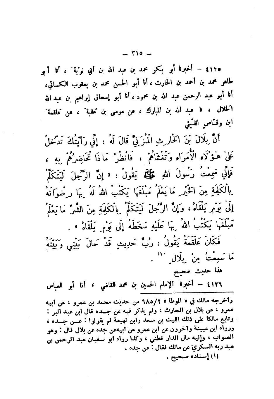 4125 - أَخْبَرَنَا أَبُو بَكْرٍ مُحَمَّدُ بْنُ عَبْدِ اللَّهِ بْنِ أَبِي تَوْبَةَ، أَنَا أَبُو طَاهِرٍ مُحَمَّدُ بْنُ أَحْمَدَ بْنِ الْحَارِثِ، أَنَا أَبُو الْحَسَنِ مُحَمَّدُ بْنُ يَعْقُوبَ الْكِسَائِيُّ، أَنَا أَبُو عَبْدِ الرَّحْمَنِ عَبْدُ اللَّهِ بْنُ مَحْمُودٍ , أَنَا أَبُو إِسْحَاقَ إِبْرَاهِيمُ بْنُ عَبْدِ اللَّهِ الْخَلالُ، نَا عَبْدُ اللَّهِ بْنُ الْمُبَارَكِ، عَنْ مُوسَى بْنِ عُقْبَةَ، عَنْ عَلْقَمَةَ بْنِ وَقَّاصٍ اللَّيْثِيِّ، أَنَّ بِلالَ بْنَ الْحَارِثِ الْمُزَنِيَّ، قَالَ لَهُ: إِنِّي رَأَيْتُكَ تَدْخُلُ عَلَى هَؤُلاءِ الأُمَرَاءِ وَتَغْشَاهُمْ، فَانْظُرْ مَاذَا تُحَاضِرُهُمْ بِهِ، فَإِنِّي سَمِعْتُ رَسُولَ اللَّهِ صَلَّى اللهُ عَلَيْهِ وَسَلَّمَ يَقُولُ: «إِنَّ الرَّجُلَ لَيَتَكَلَّمُ بِالْكَلِمَةِ مِنَ الْخَيْرِ، مَا يَعْلَمُ مَبْلَغَهَا يَكْتُبُ اللَّهُ لَهُ بِهَا رِضْوَانَهُ إِلَى يَوْمِ يَلْقَاهُ، وَإِنَّ الرَّجُلَ لَيَتَكَلَّمُ بِالْكَلِمَةِ مِنَ الشَّرِّ، مَا يَعْلَمُ مَبْلَغَهَا يَكْتُبُ اللَّهُ بِهَا عَلَيْهِ سَخَطَهُ إِلَى يَوْمِ يَلْقَاهُ».