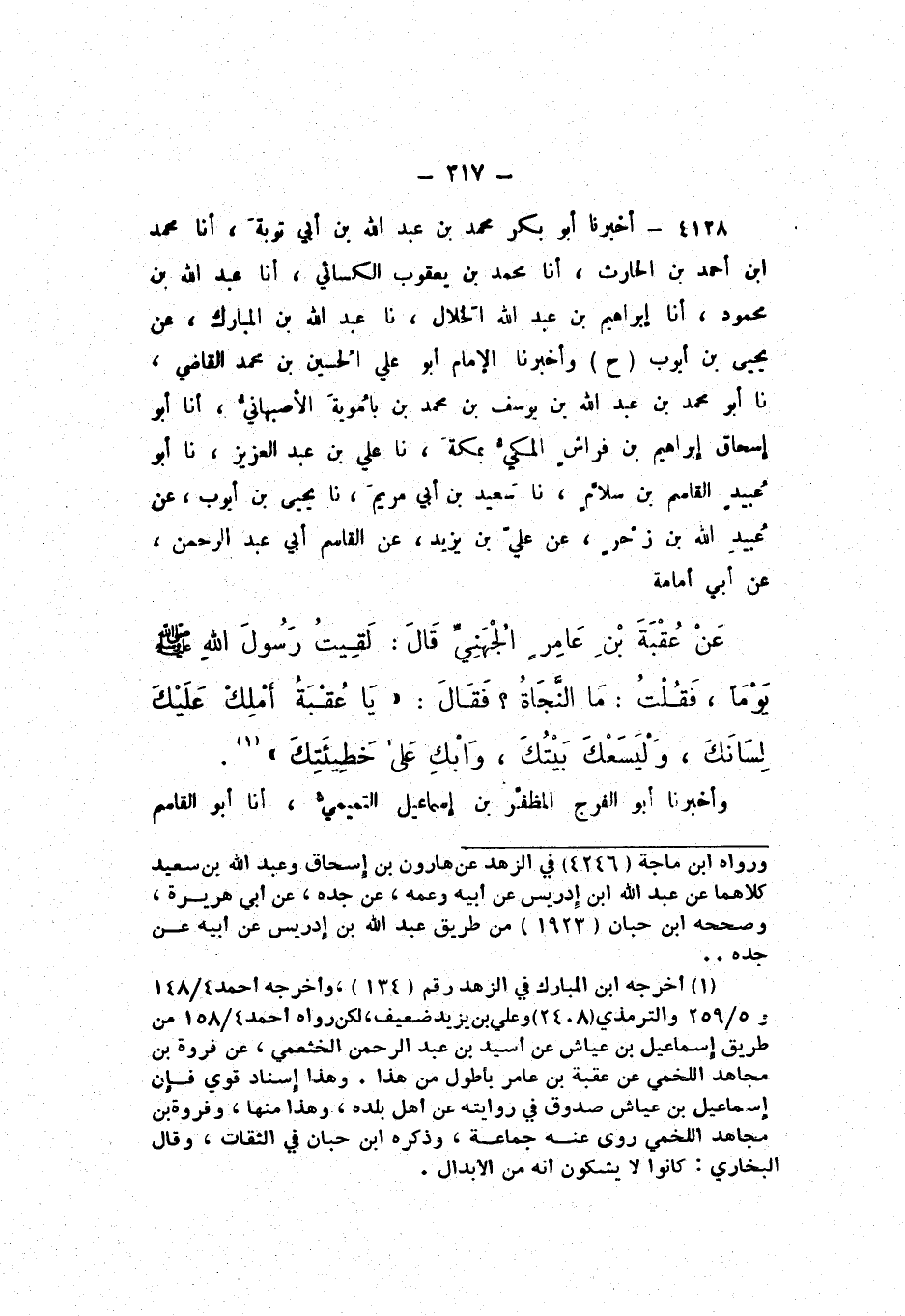 ح وَأَخْبَرَنَا الإِمَامُ أَبُو عَلِيٍّ الْحُسَيْنُ بْنُ مُحَمَّدٍ الْقَاضِي، نَا أَبُو مُحَمَّدِ بْنُ عَبْدِ اللَّهِ بْنِ يُوسُفَ بْنِ مُحَمَّدِ بْنِ بَامُوَيْهِ الأَصْبَهَانِيُّ، أَنَا أَبُو إِسْحَاقَ إِبْرَاهِيمُ بْنُ فراشٍ الْمَكِّيُّ بِمَكَّةَ، نَا عَلِيُّ بْنُ عَبْدِ الْعَزِيزِ، نَا أَبُو عُبَيْدٍ الْقَاسِمُ بْنُ سَلامٍ، نَا سَعِيدُ بْنُ أَبِي مَرْيَمَ، نَا يَحْيَى بْنُ أَيُّوبَ، عَنْ عُبَيْدِ اللَّهِ بْنِ زَحْرٍ، عَنْ عَلِيِّ بْنِ يَزِيدَ، عَنِ الْقَاسِمِ أَبِي عَبْدِ الرَّحْمَنِ، عَنْ أَبِي أُمَامَةَ، عَنْ عُقْبَةَ بْنِ عَامِرٍ الْجُهَنِيِّ، قَالَ: لَقِيتُ رَسُولَ اللَّهِ صَلَّى اللهُ عَلَيْهِ وَسَلَّمَ يَوْمًا، فَقُلْتُ: مَا النَّجَاةُ؟ فَقَالَ: «يَا عُقْبَةُ، امْلِكْ عَلَيْكَ لِسَانَكَ، وَلْيَسَعْكَ بَيْتُكَ، وَابْكِ عَلَى خَطِيئَتِكَ».