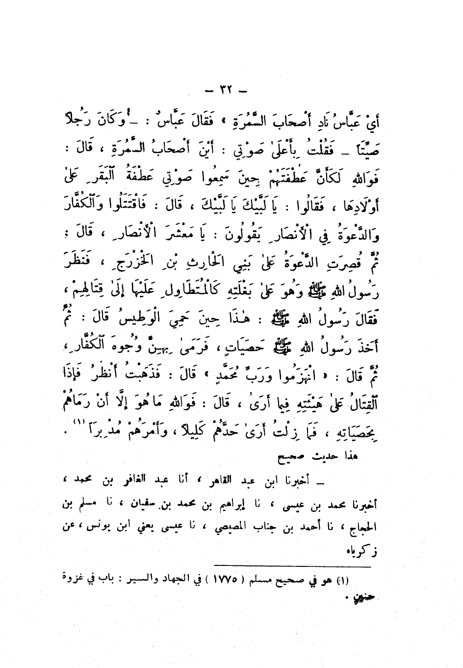 أَيْ عَبَّاسُ نَادِ أَصْحَابَ السَّمُرَةِ»، فَقَالَ عَبَّاسٌ، وَكَانَ رَجُلا صَيِّتًا، فَقُلْتُ بِأَعْلَى صَوْتِي: أَيْنَ أَصْحَابُ السَّمُرَةِ، قَالَ: فَوَاللَّهِ لَكَأَنَّ عَطْفَتَهُمْ حِينَ سَمِعُوا صَوْتِي عَطْفَةُ الْبَقَرِ عَلَى أَوْلادِهَا، فَقَالُوا: يَا لَبَّيْكَ يَا لَبَّيْكَ، قَالَ: فَاقْتَتَلُوا وَالْكُفَّارُ وَالدَّعْوَةُ فِي الأَنْصَارِ يَقُولُونَ: يَا مَعْشَرَ الأَنْصَارِ، قَالَ: ثُمَّ قُصِرَتِ الدَّعْوَةُ عَلَى بَنِي الْحَارِثِ بْنِ الْخَزْرَجِ، فَنَظَرَ رَسُولُ اللَّهِ صَلَّى اللهُ عَلَيْهِ وَسَلَّمَ وَهُوَ عَلَى بَغْلَتِهِ كَالْمُتَطَاوِلِ عَلَيْهَا إِلَى قِتَالِهِمْ، فَقَالَ رَسُولُ اللَّهِ صَلَّى اللهُ عَلَيْهِ وَسَلَّمَ: «هَذَا حِينَ حَمِيَ الْوَطِيسُ»، قَالَ: ثُمَّ أَخَذَ رَسُولُ اللَّهِ صَلَّى اللهُ عَلَيْهِ وَسَلَّمَ حَصَيَاتٍ، فَرَمَى بِهِنَّ وُجُوهَ الْكُفَّارِ، ثُمَّ قَالَ: «انْهَزَمُوا وَرَبِّ مُحَمَّدٍ»، قَالَ: فَذَهَبْتُ أَنْظُرُ فَإِذَا الْقِتَالُ عَلَى هَيْئَتِهِ فِيمَا أَرَى، قَالَ: فَوَاللَّهِ مَا هُوَ إِلا أَنْ رَمَاهُمْ بِحَصَيَاتِهِ، فَمَا زِلْتُ أَرَى حَدَّهُمْ كَلِيلا، وَأَمْرَهُمْ مُدْبِرًا.