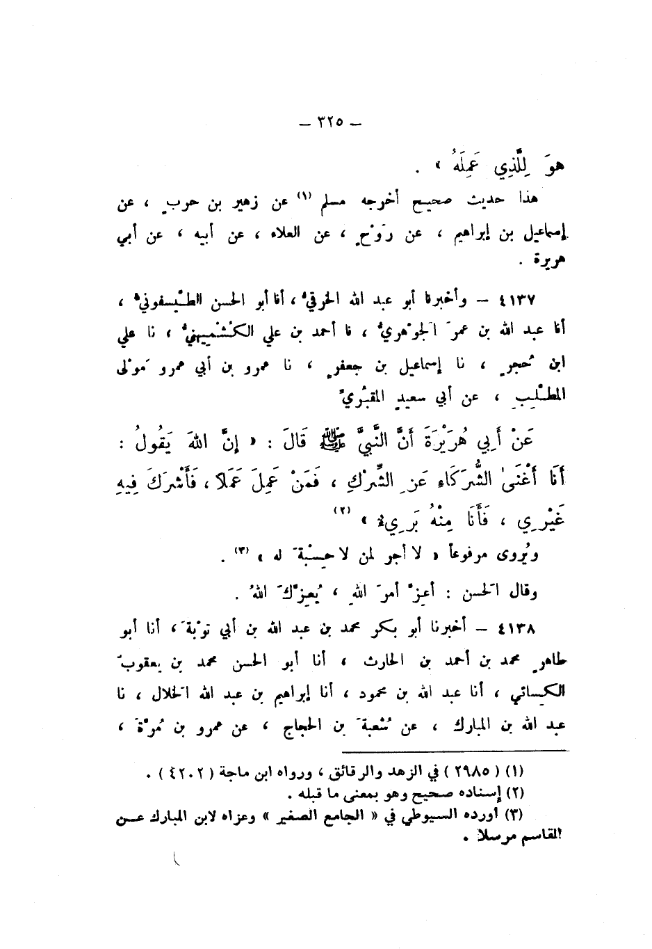 4137 - وَأَخْبَرَنَا أَبُو عَبْدِ اللَّهِ الْخِرَقِيُّ، أَنَا أَبُو الْحَسَنِ الطَّيْسَفُونِيُّ، أَنَا عَبْدُ اللَّهِ بْنُ عُمَرَ الْجَوْهَرِيُّ، نَا أَحْمَدُ بْنُ عَلِيٍّ الْكُشْمِيهَنِيُّ، نَا عَلِيُّ بْنُ حُجْرٍ، نَا إِسْمَاعِيلُ بْنُ جَعْفَرٍ، نَا عَمْرُو بْنُ أَبِي عَمْرٍو مَوْلَى الْمُطَّلِبِ، عَنْ أَبِي سَعِيدٍ الْمَقْبُرِيِّ، عَنْ أَبِي هُرَيْرَةَ، أَنّ النَّبِيَّ صَلَّى اللهُ عَلَيْهِ وَسَلَّمَ قَالَ: " إِنَّ اللَّهَ، يَقُولُ: أَنَا أَغْنَى الشُّرَكَاءِ عَنِ الشِّرْكِ، فَمَنْ عَمِلَ عَمَلا، فَأَشْرَكَ فِيهِ غَيْرِي، فَأَنَا مِنْهُ بَرِيءٌ ".