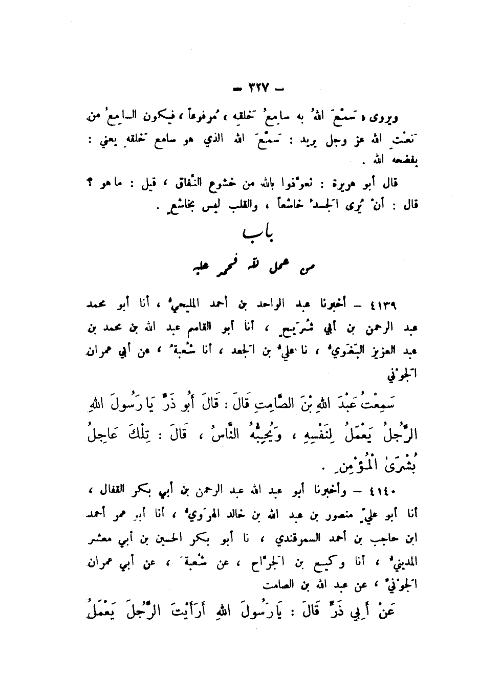 4140 - وَأَخْبَرَنَا أَبُو عَبْدِ اللَّهِ عَبْدُ الرَّحْمَنِ بْنُ أَبِي بَكْرٍ الْقَفَّالُ , أَنَا أَبُو عَلِيٍّ مَنْصُورُ بْنُ عَبْدِ اللَّهِ بْنِ خَالِدٍ الْهَرَوِيُّ، أَنَا أَبُو عُمَرَ أَحْمَدُ بْنُ حَاجِبِ بْنِ أَحْمَدَ السَّمَرْقَنْدِيُّ، نَا أَبُو بَكْرٍ الْحُسَيْنُ بْنُ أَبِي مَعْشَرٍ الْمَدِينِيُّ , أَنَا وَكِيعُ بْنُ الْجَرَّاحِ، عَنْ شُعْبَةَ، عَنْ أَبِي عِمْرَانَ الْجُونِيِّ، عَنْ عَبْدِ اللَّهِ بْنِ الصَّامِتِ، عَنْ أَبِي ذَرٍّ، قَالَ: يَا رَسُولَ اللَّهِ، أَرَأَيْتَ الرَّجُلَ يَعْمَلُ