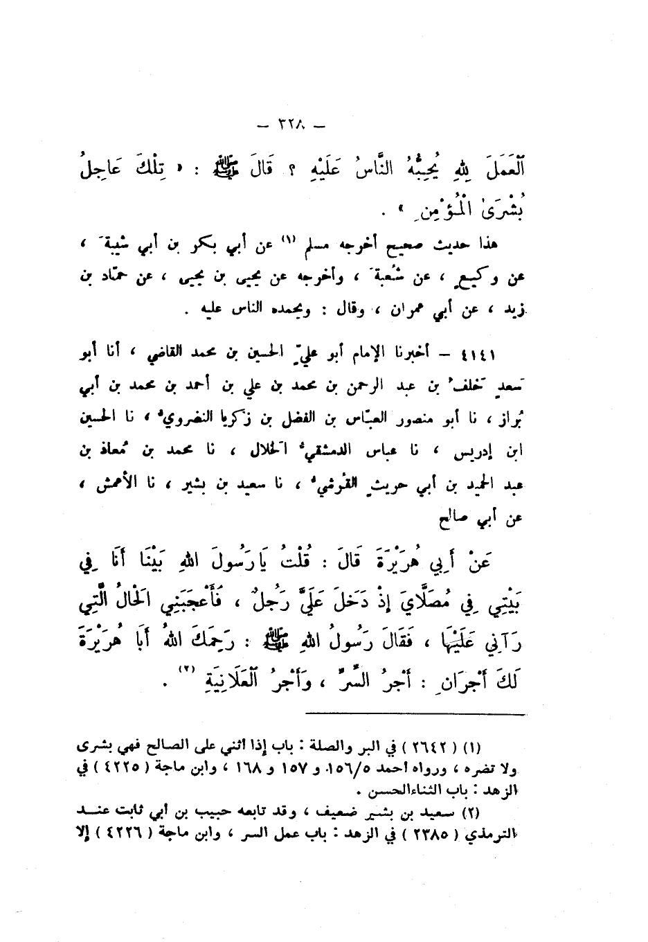 4141 - أَخْبَرَنَا الإِمَامُ أَبُو عَلِيٍّ الْحُسَيْنُ بْنُ مُحَمَّدٍ الْقَاضِي، أَنَا أَبُو سَعْدٍ خَلَفُ بْنُ عَبْدِ الرَّحْمَنِ بْنِ مُحَمَّدِ بْنِ عَلِيِّ بْنِ أَحْمَدَ بْنِ مُحَمَّدِ بْنِ أَبِي بُرَازٍ , نَا أَبُو مَنْصُورٍ الْعَبَّاسُ بْنُ الْفَضْلِ بْنِ زَكَرِيَّا النَّضْرَوِيُّ، نَا الْحُسَيْنُ بْنُ إِدْرِيسَ، نَا عَبَّاسٌ الدِّمَشْقِيُّ الْخَلالُ، نَا مُحَمَّدُ بْنُ مُعَاذِ بْنِ عَبْدِ الْحَمِيدِ بْنِ أَبِي حَرِيثٍ الْقُرَشِيُّ، نَا سَعِيدُ بْنُ بَشِيرٍ، نَا الأَعْمَشُ، عَنْ أَبِي صَالِحٍ، عَنْ أَبِي هُرَيْرَةَ، قَالَ: قُلْتُ: يَا رَسُولَ اللَّهِ، بَيْنَا أَنَا فِي بَيْتِي فِي مُصَلَّاي إِذْ دَخَلَ عَلَيَّ رَجُلٌ فَأَعْجَبَنِي الْحَالُ الَّتِي رَآنِي عَلَيْهَا، فَقَالَ رَسُولُ اللَّهِ صَلَّى اللهُ عَلَيْهِ وَسَلَّمَ: " رَحِمَكَ اللَّهُ أَبَا هُرَيْرَةَ، لَكَ أَجْرَانِ: أَجْرُ السِّرِّ، وَأَجْرُ الْعَلانِيَةِ "