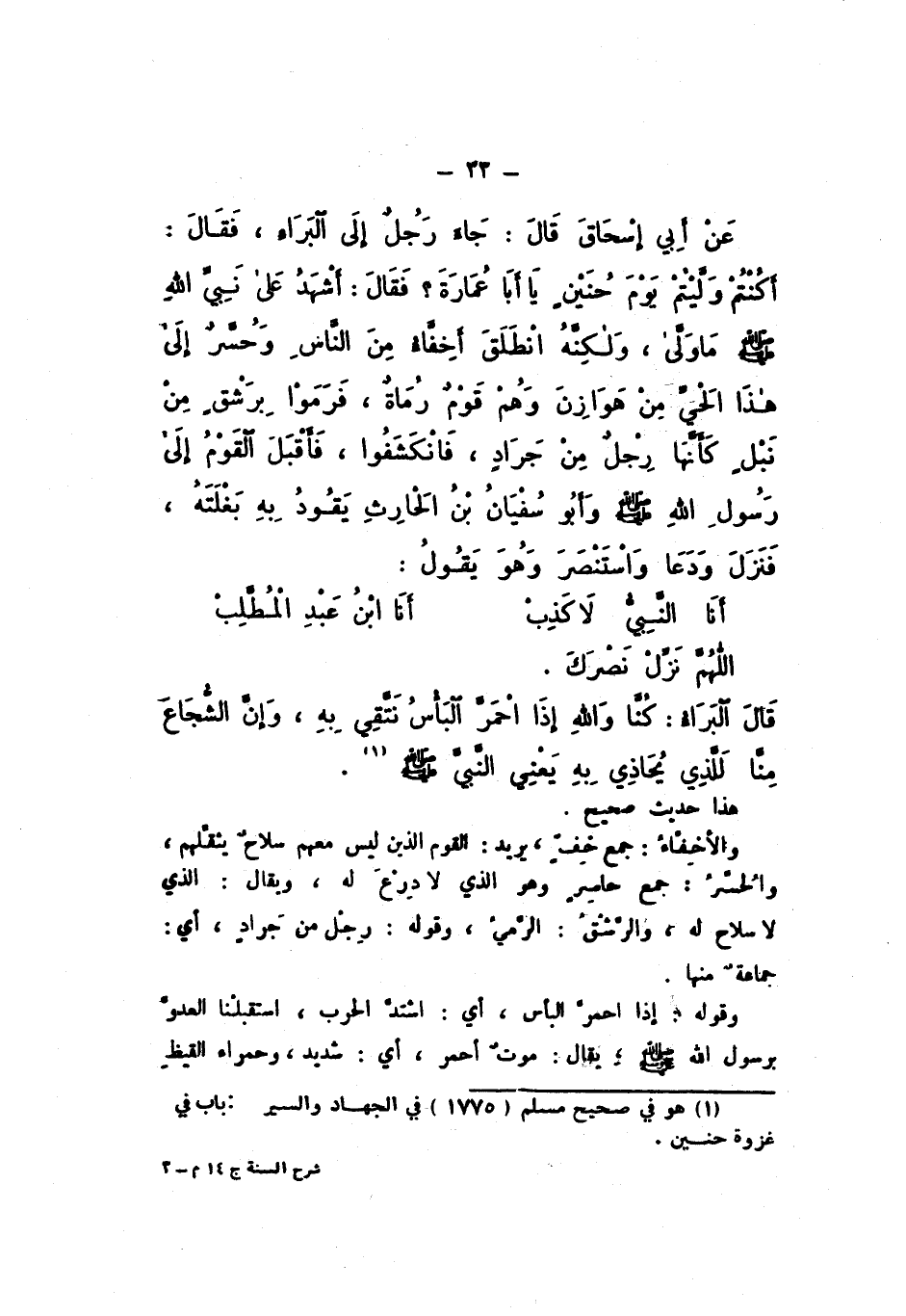 عَنْ أَبِي إِسْحَاقَ، قَالَ: جَاءَ رَجُلٌ إِلَى الْبَرَاءِ، فَقَالَ: أَكُنْتُمْ وَلَّيْتُمْ يَوْمَ حُنَيْنٍ، يَا أَبَا عُمَارَةَ؟ فَقَالَ: أَشْهَدُ عَلَى نَبِيِّ اللَّهِ صَلَّى اللهُ عَلَيْهِ وَسَلَّمَ مَا وَلَّى، وَلَكِنَّهُ انْطَلَقَ أَخِفَّاء مِنَ النَّاسِ وَحُسَّرٌ إِلَى هَذَا الْحَيِّ مِنْ هَوَازِنَ وَهُمْ قَوْمٌ رُمَاةٌ، فَرَمُوا بِرَشْقٍ مِنْ نَبْلٍ كَأَنَّهَا رِجْلٌ مِنْ جَرَادٍ، فَانْكَشَفُوا، فَأَقْبَلَ الْقَوْمُ إِلَى رَسُولِ اللَّهِ صَلَّى اللهُ عَلَيْهِ وَسَلَّمَ وَأَبُو سُفْيَانَ بْنُ الْحَارِثِ، يَقُودُ بِهِ بَغْلَتَهُ، فَنَزَلَ وَدَعَا وَاسْتَنْصَرَ، وَهُوَ يَقُولُ: «أَنَا النَّبِيُّ لَا كَذِبْ أَنَا ابْنُ عَبْدِ الْمُطَّلِبِ، اللَّهُمَّ نَزِّلْ نَصْرَكَ».