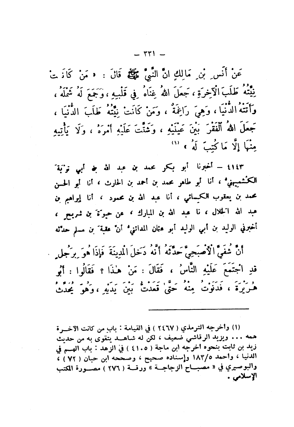 عَنْ أَنَسِ بْنِ مَالِكٍ، أَنّ النَّبِيَّ صَلَّى اللهُ عَلَيْهِ وَسَلَّمَ قَالَ: «مَنْ كَانَتْ نِيَّتُهُ طَلَبُ الآخِرَةِ جَعَلَ اللَّهُ غِنَاهُ فِي قَلْبِهِ، وَجَمَعَ لَهُ شَمْلَهُ، وَأَتَتْهُ الدُّنْيَا، وَهِيَ رَاغِمَةٌ، وَمَنْ كَانَتْ نِيَّتُهُ طَلَبُ الدُّنْيَا جَعَلَ اللَّهُ الْفَقْرَ بَيْنَ عَيْنَيْهِ، وَشَتَّتَ عَلَيْهِ أَمْرَهُ، وَلا يَأْتِيهِ مِنْهَا إِلا مَا كُتِبَ لَهُ»