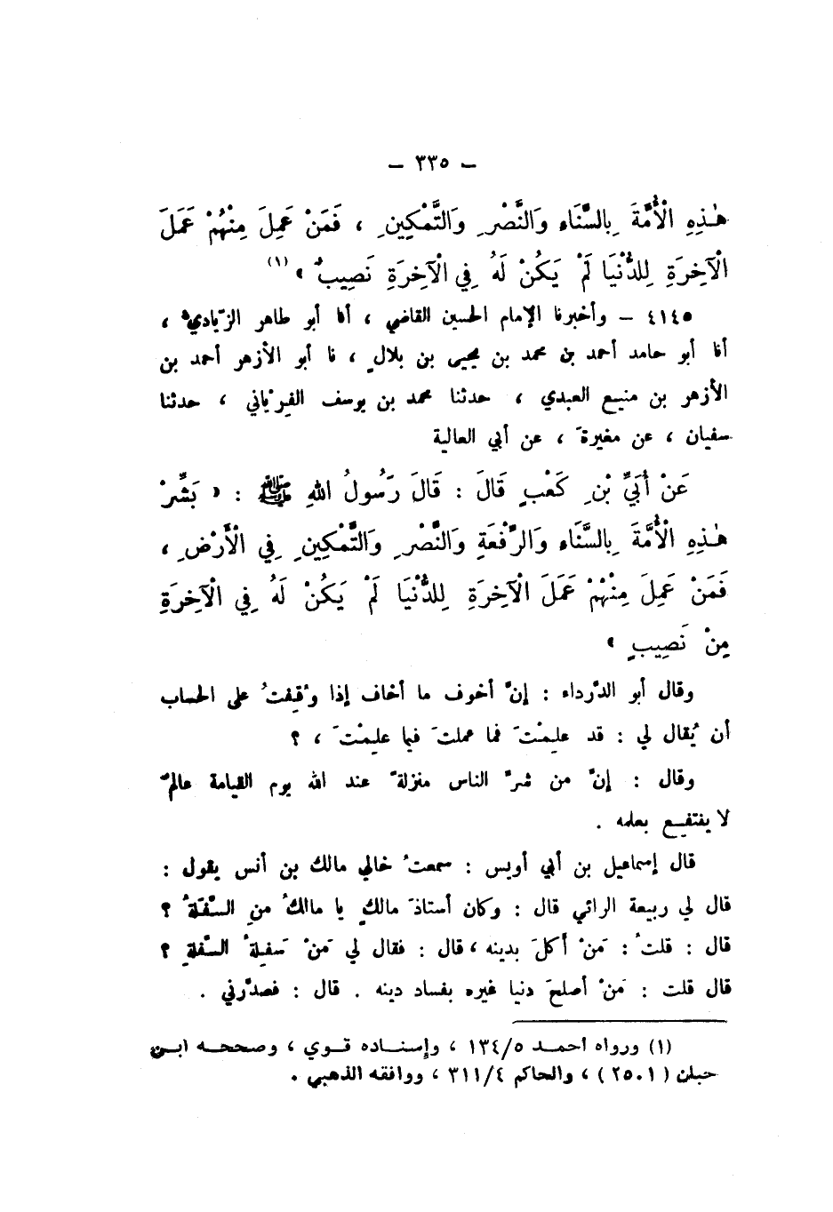 4145 - وَأَخْبَرَنَا الإِمَامُ الْحُسَيْنُ الْقَاضِي، أَنَا أَبُو طَاهِرٍ الزِّيَادِيُّ، أَنَا أَبُو حَامِدٍ أَحْمَدُ بْنُ مُحَمَّدِ بْنِ يَحْيَى بْنِ بِلالٍ، نَا أَبُو الأَزْهَرِ أَحْمَدُ بْنُ الأَزْهَرِ بْنِ مَنِيعٍ الْعَبْدِيِّ، حَدَّثَنَا مُحَمَّدُ بْنُ يُوسُفَ الْفِرْيَانِيُّ، حَدَّثَنَا سُفْيَانُ، عَنْ مُغِيرَةَ، عَنْ أَبِي الْعَالِيَةِ، عَنْ أُبَيِّ بْنِ كَعْبٍ، قَالَ: قَالَ رَسُولُ اللَّهِ صَلَّى اللهُ عَلَيْهِ وَسَلَّمَ: «بَشِّرْ هَذِهِ الأُمَّةَ بِالسَّنَاءِ، وَالرِّفْعَةِ، وَالنَّصْرِ وَالتَّمْكِينِ، فِي الأَرْضِ، فَمَنْ عَمِلَ مِنْهُمْ عَمَلَ الآخِرَةِ لِلدُّنْيَا لَمْ يَكُنْ لَهُ فِي الآخِرَةِ نَصِيبٌ»