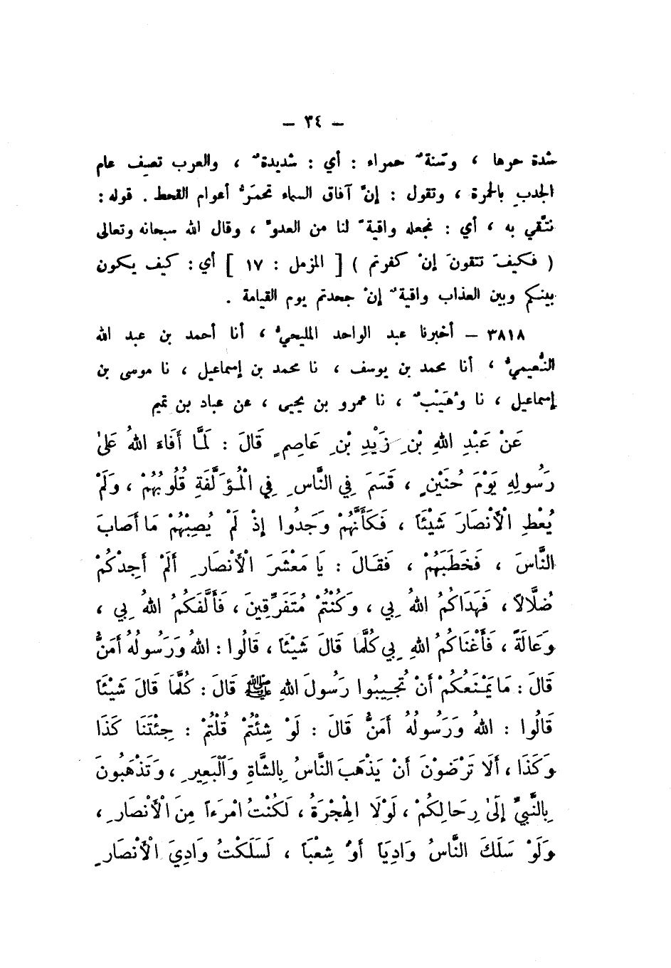 3818 - أَخْبَرَنَا عَبْدُ الْوَاحِدِ الْمَلِيحِيُّ، أَنَا أَحْمَدُ بْنُ عَبْدِ اللَّهِ النُّعَيْمِيُّ، أَنَا مُحَمَّدُ بْنُ يُوسُفَ، نَا مُحَمَّدُ بْنُ إِسْمَاعِيلَ، نَا مُوسَى بْنُ إِسْمَاعِيلَ، نَا وُهَيْبٌ، نَا عَمْرُو بْنُ يَحْيَى، عَنْ عَبَّادِ بْنِ تَمِيمٍ، عَنْ عَبْدِ اللَّهِ بْنِ زَيْدِ بْنِ عَاصِمٍ، قَالَ: لَمَّا أَفَاءَ اللَّهُ عَلَى رَسُولِهِ يَوْمَ حُنَيْنٍ، قَسَمَ فِي النَّاسِ، فِي الْمُؤَلَّفَةِ قُلُوبُهُمْ، وَلَمْ يُعْطِ الأَنْصَارَ شَيْئًا، فَكَأَنَّهُمْ وَجَدُوا إِذْ لَمْ يُصِبْهُمْ مَا أَصَابَ النَّاسَ، فَخَطَبَهُمْ، فَقَالَ: «يَا مَعْشَرَ الأَنْصَارِ أَلَمْ أَجِدْكُمْ ضُلالا، فَهَدَاكُمُ اللَّهُ بِي، وَكُنْتُمْ مُتَفَرِّقِينَ، فَأَلَّفَكُمُ اللَّهُ بِي، وَعَالَةً، فَأَغْنَاكُمُ اللَّهُ بِي»، كُلَّمَا قَالَ شَيْئًا، قَالُوا: اللَّهُ وَرَسُولُهُ أَمَنُّ، قَالَ: «مَا يَمْنَعُكُمْ أَنْ تُجِيبُوا رَسُولَ اللَّهِ صَلَّى اللهُ عَلَيْهِ وَسَلَّمَ»، قَالَ: كُلَّمَا قَالَ شَيْئًا، قَالُوا: اللَّهُ وَرَسُولُهُ أَمَنُّ، قَالَ: " لَوْ شِئْتُمْ قُلْتُمْ: جِئْتَنَا كَذَا وَكَذَا، أَلا تَرْضَوْنَ أَنْ يَذْهَبَ النَّاسُ بِالشَّاةِ وَالْبَعِيرِ، وَتَذْهَبُونَ بِالنَّبِيِّ إِلَى رِحَالِكُمْ، لَوْلا الْهِجْرَةُ، لَكُنْتُ امْرَأً مِنَ الأَنْصَارِ، وَلَوْ سَلَكَ النَّاسُ وَادِيًا أَوْ شِعْبًا لَسَلَكْتُ وَادِيَ الأَنْصَارِ