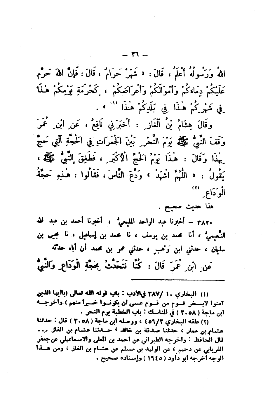 3820 - أَخْبَرَنَا عَبْدُ الْوَاحِدِ الْمَلِيحِيُّ، أَنَا أَحْمَدُ بْنُ عَبْدِ اللَّهِ النُّعَيْمِيُّ، أَنَا مُحَمَّدُ بْنُ يُوسُفَ، نَا مُحَمَّدُ بْنُ إِسْمَاعِيلَ، نَا يَحْيَى بْنُ سُلَيْمَانَ، حَدَّثَنِي ابْنُ وَهْبٍ، حَدَّثَنِي عُمَرُ بْنُ مُحَمَّدٍ، أَنَّ أَبَاهُ حَدَّثَهُ، عَنِ ابْنِ عُمَرَ، قَالَ: كُنَّا نَتَحَدَّثُ بِحِجَّةِ الْوَدَاعِ، وَالنَّبِيُّ صَلَّى اللهُ عَلَيْهِ وَسَلَّمَ