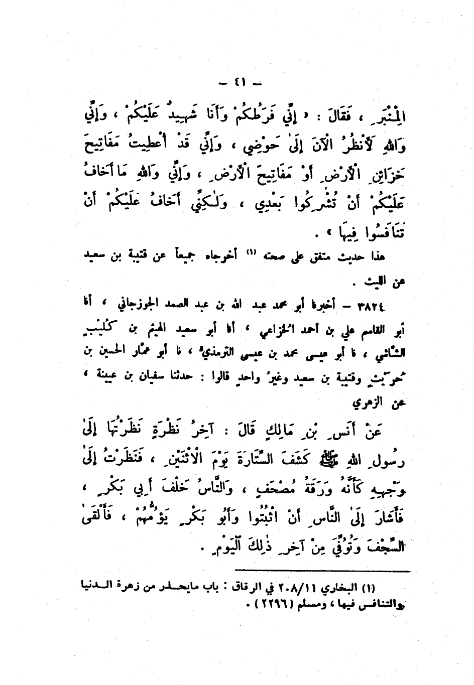 الْمِنْبَرِ، فَقَالَ: «إِنِّي فَرَطُكُمْ وَأَنَا شَهِيدٌ عَلَيْكُمْ، وَإِنِّي وَاللَّهِ لأَنْظُرُ الآنَ إِلَى حَوْضِي، وَإِنِّي قَدْ أُعْطِيتُ مَفَاتِيحَ خَزَائِنِ الأَرْضِ أَوْ مَفَاتِيحَ الأَرْضِ، وَإِنِّي وَاللَّهِ مَا أَخَافُ عَلَيْكُمْ أَنْ تُشْرِكُوا بَعْدِي، وَلَكِنِّي أَخَافُ عَلَيْكُمْ أَنْ تَنَافَسُوا فِيهَا».