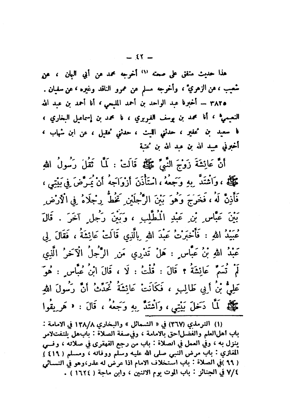 3825 - أَخْبَرَنَا عَبْدُ الْوَاحِدِ الْمَلِيحِيُّ، أَنَا أَحْمَدُ بْنُ عَبْدِ اللَّهِ النُّعَيْمِيُّ، أَنَا مُحَمَّدُ بْنُ يُوسُفَ الْفَرَبْرِيُّ، نَا مُحَمَّدُ بْنُ إِسْمَاعِيلَ الْبُخَارِيُّ، نَا سَعِيدُ بْنُ عُفَيْرٍ، حَدَّثَنِي اللَّيْثُ، حَدَّثَنِي عَقِيلٌ، عَنِ ابْنِ شِهَابٍ، أَخْبَرَنِي عُبَيْدُ اللَّهِ بْنُ عَبْدِ اللَّهِ بْنِ عُتْبَةَ، أَنَّ عَائِشَةَ زَوْجَ النَّبِيِّ صَلَّى اللهُ عَلَيْهِ وَسَلَّمَ قَالَتْ: لَمَّا ثَقُلَ رَسُولُ اللَّهِ صَلَّى اللهُ عَلَيْهِ وَسَلَّمَ وَاشْتَدَّ بِهِ وَجَعُهُ، اسْتَأْذَنَ أَزْوَاجَهُ أَنْ يُمَرَّضَ فِي بَيْتِي، فَأَذِنَّ لَهُ، فَخَرَجَ وَهُوَ بَيْنَ الرَّجُلَيْنِ تَخُطُّ رِجْلاهُ فِي الأَرْضِ بَيْنَ عَبَّاسِ بْنِ عَبْدِ الْمُطَّلِبِ وَبَيْنَ رَجُلٍ آخَرَ , قَالَ عُبَيْدُ اللَّهِ: فَأَخْبَرْتُ عَبْدَ اللَّهِ بِالَّذِي قَالَتْ عَائِشَةُ، فَقَالَ لِي عَبْدُ اللَّهِ بْنُ عَبَّاسٍ: هَلْ تَدْرِي مَنِ الرَّجُلُ الآخَرُ الَّذِي لَمْ تُسَمِّ عَائِشَةُ؟ قَالَ: قُلْتُ: لَا، قَالَ ابْنُ عَبَّاسٍ هُوَ عَلِيُّ بْنُ أَبِي طَالِبٍ، فَكَانَتْ عَائِشَةُ تُحَدِّثُ أَنَّ رَسُولَ اللَّهِ صَلَّى اللهُ عَلَيْهِ وَسَلَّمَ لَمَّا دَخَلَ بَيْتِي، وَاشْتَدَّ بِهِ وَجَعُهُ، قَالَ: «هَرِيقُوا